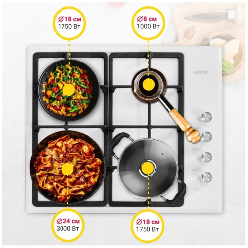 Газовая варочная панель Simfer H60Q40W416 - модель, которая благодаря своим компактным размерам органично впишется в интерьер вашей кухни и сделает ежедневный процесс приготовления еды комфортным. В качестве материала для изготовления варочной поверхности использовалась эмалированная сталь, которая в разы упрощает утомительный процесс ухода за ней и делает процесс очистки лёгким и удобным. На ней располагаются четыре конфорки - разные по диаметру и мощности пламени в них. А значит вы сможете выбрать оптимальную конфорку для приготовления разнообразных блюд. Для удобного пользования в поворотные переключатели встроен электроподжиг, который значительно упрощает работу с панелью. Начните готовить изысканные блюда вместе с варочной панелью Simfer!