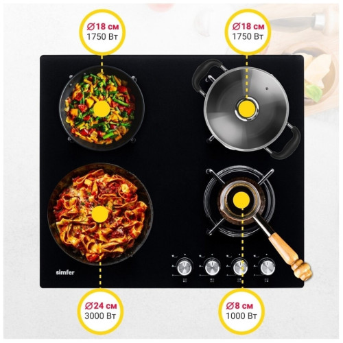 Газовая варочная панель Simfer H60N40B570 - модель, которая благодаря своим компактным размерам органично впишется в интерьер вашей кухни и сделает ежедневный процесс приготовления еды комфортным. В качестве материала для изготовления варочной поверхности использовалось закаленное стекло, которое в разы упрощает утомительный процесс ухода за ним и делает процесс очистки лёгким и удобным. На ней располагаются четыре конфорки - разные по диаметру и мощности пламени в них. А значит вы сможете выбрать оптимальную конфорку для приготовления разнообразных блюд. В поворотные переключатели встроен электроподжиг, который значительно упрощает работу с панелью, а система газ-контроля предотвращает возможность случайной утечки газа в случае угасания пламени.