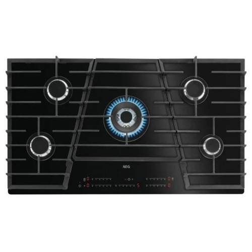 Газовая варочная панель чёрного цвета с покрытием из закалённого стекла и чугунными решётками. Модель оснащена пятью конфорками, одна из которых с "двойной короной", а также автоматическим электроподжигом, газ-контролем и сенсорным управлением.