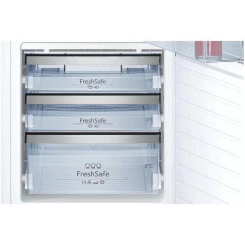 Холодильник с зоной свежести позволяет дольше сохранять свежесть продуктов. Специальный прозрачный ящик Fresh Safe, расположенный в самой холодной части холодильника, защищает фрукты и овощи. В холодильной камере есть 4 полки из ударопрочного стекла, 3 выдвижных бокса на телескопических полозьях, разделяющий бокс, а также дверной контейнер с крышкой с технологией Slide & Hide, которые помогут удобно расположить все продукты. Полностью автоматическое оттаивание холодильного отделения сократит время на уход за техникой. Реализована электронная регулировка и контроль температуры, а также режим суперохлаждения с автоматическим отключением. Динамическое охлаждение осуществляется при помощи внешнего вентилятора. Холодильник оснащён угольным фильтром. Предусмотрен акустический сигнал тревоги для холодильного и морозильного отделения. Долговечное светодиодное освещение подаёт яркий свет сверху вниз. Преимущество не только в том, что вы действительно хорошо видите продукты, но и в экономии энергии, поскольку светодиод не нагревается.