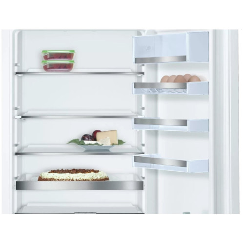 Компактный холодильник Bosch KIR 31AF30 R подойдет для установки в любой кухне, даже в условиях ограниченного пространства. Автоматическая система оттаивания повышает комфорт эксплуатации прибора. Пять полок из ударопрочного стекла и глубокие ниши, расположенные в дверце, позволяют разместить максимальное количество продуктов. Зона HydroFresh предназначена для максимально долгого и качественного сохранения фруктов и овощей. Качественное безбликовое светодиодное освещение повышают комфорт эксплуатации. Ключевые преимущества: Полки из ударопрочного стекла Выдвигающаяся полка EasyAccess для удобства загрузки продуктов; Возможность перенавешивания двери. Габариты (ШxГxВ) 55.8x54.5x102.1 см Количество дверей 1 Количество камер 1 Количество компрессоров 1 Расположение встраиваемый Тип холодильник без морозильника Управление электронное Цвет / Материал покрытия белый / пластик/металл Энергопотребление класс A++ (100 кВтч/год) Дополнительные возможности суперохлаждение, индикация температуры Размораживание холодильной камеры капельная система Общий объем 174 л Возможность перевешивания двери есть Климатический класс SN, T Материал полок стекло Уровень шума до 33 дБ Срок гарантии 1 год