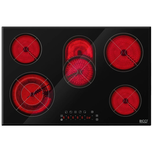 Электрическая поверхность независимая Стеклокерамическая Сенсорное управление Количество конфорок: 5 Габариты: 77x52 см Индикатор остаточного тепла 9 уровней мощности Таймер 99 мин Автоматическое отключение