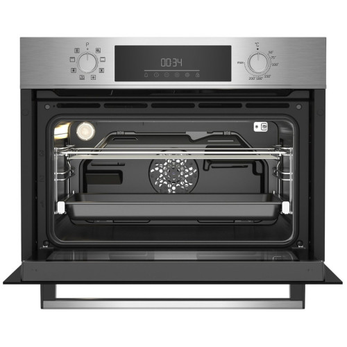 Компактный мультифункциональный духовой шкаф объемом 48 л с отделкой из нержавеющей стали. Модель оснащена LED дисплеем и поворотными переключателями. Духовка имеет 8 программ готовки, включая гриль, разморозку и 3D приготовление, последний позволяет готовить несколько блюд одновременно. Трехслойное стекло в дверце духовки обеспечивает безопасность ее использования, не позволяя Вам обжечься. Для удобства уборки внутренняя стеклянная поверхность дверцы снимается. В комплекте: стандартный противень и решетка.