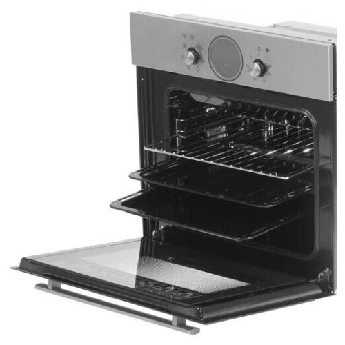 Электрический духовой шкаф. Классический дизайн современного образца, управление осуществляется двумя поворотными ручками: выбор режима работы и температуры нагрева. В середине панели управления установлен сенсорный таймер, есть часы и звуковой сигнал окончания работы программы. Помимо классического нагрева с автоматическим поддержанием заданной температуры, в комплектации присутствует электрогриль и вертел. Есть конвекция, равномерно распределяющая жар внутри шкафа. Запросто приготовить курицу-гриль, подрумянить выпечку, целиком запечь кусок мяса - духовой шкаф позволяет создавать кулинарные шедевры легко и просто. Продуман и контроль за готовностью блюда, внутреннее освещение - двухточечное, через двойное стекло прекрасно все видно и без открытия дверцы. Уход за прибором не доставляет проблем, для удобного доступа направляющие для противней и дверца - выполнены съемными. Размеры монтажного проема - 56x55x58 см (ШхГхВ), сетевой шнур и вилка в наличии. Ключевые преимущества: - Таймер сенсорный; - Усиленный гриль с конвекцией; - Подсветка духовки двойная; - Съемные проволочные направляющие духовки.