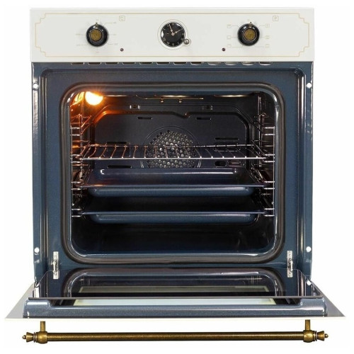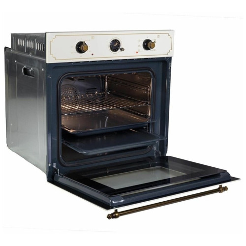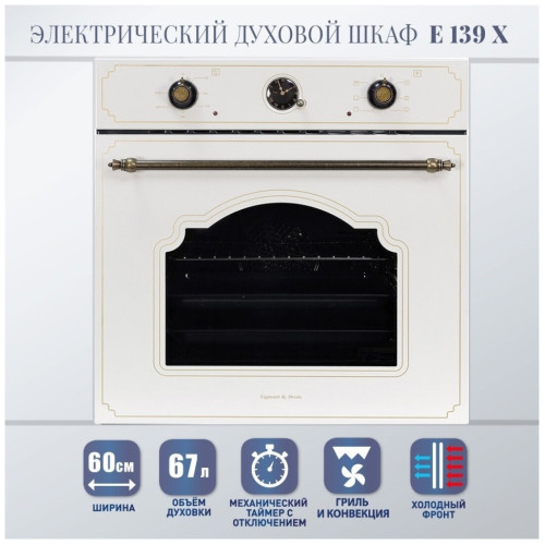 Встраиваемый духовой шкаф E 139 Х & это высокоэффективная, мультифункциональная техника для кухни, которое упростит процесс готовки и разнообразит домашний рацион. Устройство отличается расширенным функционалом, включающим в себя такие функции, как разморозка продуктов, гриль, нижний и верхний нагреватель. Наличие вентилятора обеспечивает равномерное распределение температуры внутри духового шкафа. Для приготовления блюд шкаф комплектуется решеткой и двумя противнями разной глубины под соответсвующие задачи. Общий объем внутреннего пространства составляет 67 л. Уникальный дизайн Country в бежевом исполнении дополнит интерьер и подарит эстетическое удовольствие. Установка необходимых режимов приготовления производится с использованием поворотных регуляторов, которые размещаются на фронтальной поверхности. Наличие таймера позволяет устанавливать время приготовления. Холодный фронт и тангенциальное охлаждение обеспечивает высокий уровень безопасности и исключает получение ожогов при использовании духовки. Духовой шкаф Zigmund & Shtain станет отличным помощником на кухне и украшением кухни. Наличие такой духовки позволяет организовать приготовление пищи в любое, удобное время с минимальными затратами.