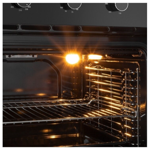 Поворотные ручки в сочетании с современным сенсорным управлением обеспечивают комфортное и наиболее точную регулировку параметров приготовления. Большой цифровой дисплей духового шкафа отображает всю необходимую информацию. Установите таймер на время, необходимое для приготовления блюда и занимайтесь своими делами. В нужное время таймер оповестит вас о готовности. Технология "Холодный фронт" представляет собой верх безопасности и защиты. Такая технология обезопасит вас от ожогов или неприятных ощущений при случайном касании, а мебель от повреждения. Благодаря грилю блюдо приобретет поджаристую корочку, оставаясь нежным и сочным внутри. Трамп-линии на внутреннем стекле дверцы создают визуальный эффект непрозрачности фасада: при выключенном освещении не видно посуду, находящуюся внутри духовой камеры, а при включенном освещении можно в деталях рассмотреть весь процесс готовки. Внутри камеры установлены 5 уровней хромированных направляющих. Такие направляющие отличаются высокой износостойкостью, устойчивостью к воздействию химических веществ. Яркое внутреннее освещение делает процесс приготовления блюд ещё приятнее. Вы всегда сможете видеть состояние готовящихся блюд, контролировать их готовность, даже не открывая шкафа. Газ-контроль — система безопасности, которая автоматически прекратит подачу газа, если пламя по каким-либо причинам погаснет. Благодаря системе "Электроподжиг" больше не придется пользоваться спичками и зажигалками. Система очень удобна и безопасна. Мощный вентилятор, который обеспечивает непрерывную циркуляцию холодного воздуха между рабочей камерой и корпусом духового шкафа, надёжно защищает рядом стоящую мебель от нагрева и деформаций.