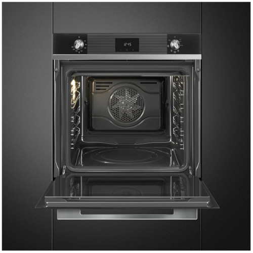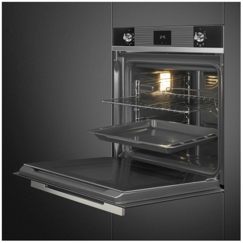 Духовой шкаф Smeg SF6100VN1 имеет чёткие линии и элегантный дизайн, свойственный коллекции Linea. Он выглядит современно благодаря черному стеклу и серебристой фурнитуре. Управление осуществляется через поворотные переключатели из поликарбоната и LED-дисплеем с сенсорами. Левый механический регулятор даёт настроить нагрев от 30 до 250 градусов. Стабильность показателей сохраняет электронный контроллер. Когда камера прогревается до заданных параметров, загорается индикаторная лампочка. Таймер можно установить на отложенный старт (от 1 минуты до 23:59). Также есть возможность настроить отложенный старт. После этого духовка подаст сигнал. В модели Смег SF6100VN1 есть 6 режимов, состоящих из верхнего, нижнего жара, гриля, конвекции и их комбинаций. В их перечень входит и ECO. Он создаёт высокую температуру для комфортного выпекания при минимальной затрате электроэнергии. ECO-logic действует схожим образом, она снижает общую нагрузку на сеть от всех одновременно работающих электроприборов. Паровая очистка размягчает загрязнения и жир, которые потом легко убираются со стенок, покрытых мелкопористой эмалью. Кроме того, тройное остекление, как и тангенциальное охлаждение корпуса обеспечивают безопасность. За неё же отвечает и блокировка настроек.