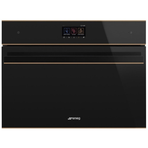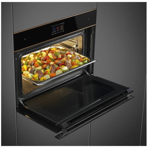 Компактный многофункциональный духовой шкаф. Общие данные: Габариты: 45х60х50 см Габариты ниши для встраивания: 44.5-44.7x55.4-56.4х56 см Полезный объем: 41 л Емкость для воды 1,2 л Гриль: есть Подсветка: 1 галогенная лампа (40 Вт) Функции очистки: паровая очистка Режимы приготовления: 15 функций приготовления (5 с использованием пара) 65 автоматических рецептов приготовления Дополнительные функции: размораживание по времени, размораживание по весу, поднятие теста, шаббат, разогрев и регенерация. Управление и функции: Цветной TFT-дисплей с сенсорным управлением SmegConnect Электронный программатор: таймер, отсрочка включения, автоматическое выключение Акустический сигнал окончания приготовления Режим Showroom Электронный контроль температуры (30-250С) Быстрый предварительный разогрев Безопасность: Тангенциальная система охлаждения Блокировка управления 3 стекла дверцы Автоматическое отключение при открытой дверце Принадлежности: Глубокий эмалированный противень, 40 мм Решетка для противня 1 противень глубокий из перфорированной стали 1 противень из нержавеющей стали, 20 мм 1 решетка с задним упором Телескопические направляющие неполного выдвижения Термощуп Губка/ Крышка парогенератора Дополнительная информация: Обработка протв отпечатков пальцев Режим ограничения мощности Система плавного закрытия дверцы Soft Close Металлические направляющие Эмаль Ever Clean Откидной гриль Другие опции: поддержание тепла, ECO light. Внутреннее стекло дверцы сплошное съемное Номинальная мощность: 3,1 кВт Мощность гриля: 2,0 кВт Вилка для подключения к электрической сети в комплект не входит
