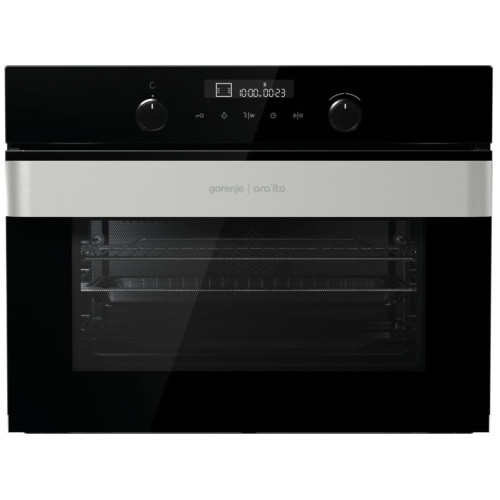 Артикул: 379-513 Встраиваемый электрический духовой шкаф Gorenje BCM 547 ORAB Встраиваемая компактная духовка Gorenje BCM547ORAB из коллекции Ora-Ito — многофункциональный прибор с возможностью сочетать конвекцию, микроволны и гриль. Инверторная технология позволяет снизить расход электроэнергии, нагрев происходит быстрее, кроме того не разрушается структура пищи. Управление при помощи утапливаемых переключателей и сенсорного программатора IconLED+ удобно и интуитивно понятно. Очистка паром AquaClean с помощью микроволн эффективна и без особых усилий позволяет содержать внутренние поверхности в чистоте. Ключевые преимущества: Очистка паромМногоуровневое приготовлениеСенсорный программатор IconLED+