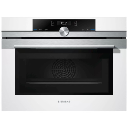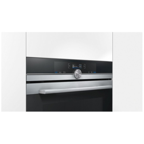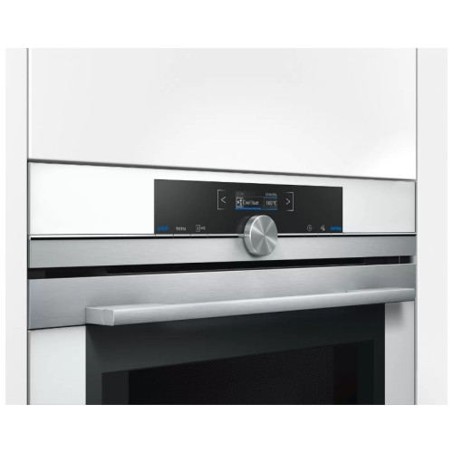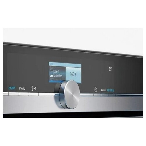 Духовой шкаф Siemens готовит блюда в два раза быстрее за счет использования СВЧ varioSpeed. Режим 4D-горячий воздух равномерно распределяет тепло по внутреннему пространству, что позволяет запекать на четырех уровнях одновременно, при этом запахи не будут смешиваться. Данная опция помогает сэкономить время и электроэнергию. Дисплей с белой подсветкой хорошо виден под любым углом и отображает актуальную температуру нагрева, что обеспечивает точный контроль за работой техники. При открывании двери подача микроволн автоматически прекращается, что гарантирует безопасность эксплуатации.