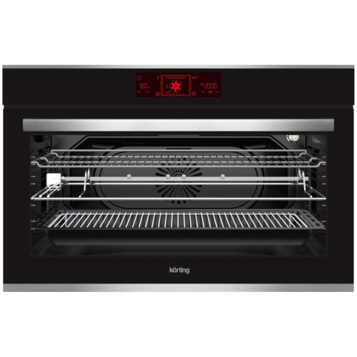 Большие габариты Духовой шкаф размером 90 сантиметров отлично подойдет для увеличенных площадей кухонь и больших семей, где блюда готовятся, практически, как в ресторане или мини-пекарне. Большой объем, наличие конвектора и вертела придает этому прибору статус профессионального духового шкафа. Сенсорное управление Сенсорное управление позволяет моментально выбрать одну из многочисленных функций. Одним касанием можно включить подсветку камеры, выбрать режим нагрева, температуру, настроить таймеры или заблокировать управление. Телескопические направляющие Телескопические направляющие надежно удерживают противень на одном из нескольких уровней, что дает еще больше безопасности и комфорта – противень не нужно удерживать в руках, чтобы проверить качество приготовления блюд. Конвекция Конвекционный вентилятор обеспечивает постоянную циркуляцию горячего воздуха по всей камере, что позволяет равномерно запекать блюдо со всех сторон, а также экономить время на приготовление. Режим конвекции особенно оценят любители приготовления выпечки. Тройное остекление дверцы Специальные материалы стекла обладают свойствами защитного экрана, удерживающего тепло внутри камеры, а конструкция дверцы с применением трех стекол позволяет снизить температуру фронтальной поверхности до минимума. Все это снижает потребление электроэнергии и делает приготовление полностью безопасным. Освещаемая камера духового шкафа Включив лампу, установленную внутри шкафа, можно видеть внутреннее пространство, не открывая дверцу и не выпуская тепло из рабочей камеры. Система автоматического охлаждения Специальный тангенциальный вентилятор установлен во всех духовых шкафах Körting. Боковые стенки духового шкафа постоянно охлаждаются благодаря циркуляции холодного воздуха. Использование системы автоматического охлаждения позволяет поддерживать температуру боковых поверхностей духового шкафа на низком уровне для безопасного использования в кухонной мебели.