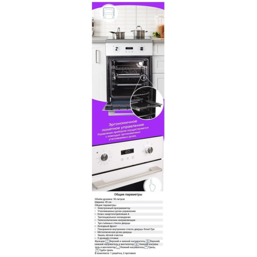 Духовой шкаф E 145 W отличается лаконичным дизайном, понятным управлением и компактными размерами. При ширине всего 45 см он отлично впишется в габариты небольшой городской кухни. А емкая духовка с объемом 50 л позволит готовить блюда на большую семью с детьми. При разработке дизайна духовки специалисты решили обеспечить покупателю максимальную безопасность. Для этого духовой шкаф оснастили: · Утапливаемыми ручками управления — их можно спрятать в духовой шкаф, что делает проще уборку и заботится о безопасности и эстетике кухонного пространства; · тройным стеклом дверцы и холодным фронтом — при максимальной прозрачности защита убережет хозяйку от ожогов; · ускоренным разогревом — рабочая температура достигается в течение 3 минут; · телескопическими направляющими — для бесшумного и беспрепятственного скольжения противней. · Тангециальное охлаждение гарантирует безопасное использование & высокая температура не навредит работе духового шкафа и кухонному гарнитуру. · 6 программ приготовления, среди которых комбинированные режими с конвекцией, гриль и турбо-гриль. Эти отличия делают духовку Zigmund & Shtain E 145 W желательным гостем на любой кухне. В комплекте предусмотрены два противня разной глубины. Завершает компоновку решетка, подходящая для запекания мяса, овощей в режиме «гриль». Модель духового шкафа выпускается в белом дизайне, поэтому отлично впишется в современный интерьер. На товар действует гарантия по системе 3+2, где первые три года товар находится на полном гарантийном обслуживании, а затем два года есть возможность получить запчасти бесплатно.