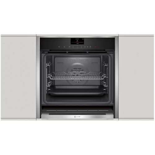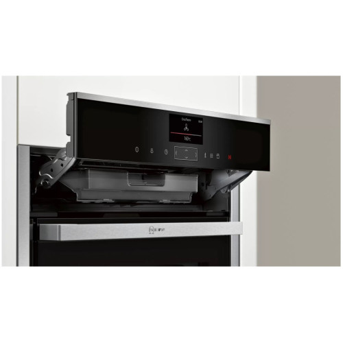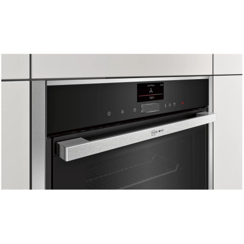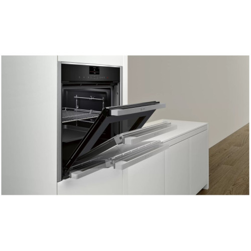 Встраиваемый электрический духовой шкаф с функцией FullSteam и Slide & Hide объединяет в себе духовой шкаф и пароварку с удобным доступом к противням. Приготовьте одновременно несколько блюд для полноценного обеда или ужина в одном духовом шкафу. С CircoTherm от NEFF вы можете одновременно запекать рыбу, лазанью, пирог и не только. Мощный направленный поток воздуха обеспечит сочность и неповторимый аромат ваших блюд. Автоматические программы Baking and Roasting Assistant — отличные помощники. Они помогут выбрать оптимальный температурный режим, время и программы для различных блюд. Выберите блюдо, подтвердите выбор — остальное сделает духовка. FullSteam поможет приготовить на пару овощи, выпечь хлеб, подогреть блюдо и запечь курицу по своему любимому рецепту. Использование пара при приготовлении блюда поможет сохранить его сочность, ароматность и индивидуальность. Переключатель Shift Control позволяет быстро перемещаться между разделами меню. Достаточно одного прикосновения, чтобы проверить, набрала ли духовка заданную температуру, изменить режим, если того требует рецепт, или увидеть, сколько осталось ждать до момента, когда блюдо можно будет поставить на стол. Дверца Slide & Hide плавно исчезает в нише под рабочей камерой, не уменьшая объём духовки и обеспечивая удобный доступ к блюду. При открывании и закрывании дверцы духового шкафа ручка повторяет движение вашей кисти и всегда находится в удобном положении. Самоочищающееся покрытие EcoClean находится на задней стенке с обеих сторон. Процесс очистки запускается каждый раз при включении духового шкафа. Поверхности с покрытием EcoClean останутся чистыми на протяжении всего срока службы прибора. LED-освещение подчёркивает индивидуальность дизайна кухни и оптимально освещает рабочую поверхность, а также способствует сохранению энергии.