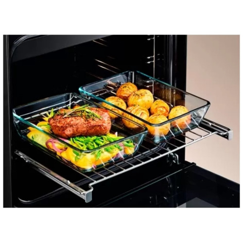 Электрический духовой шкаф AEG BER 455120B откроет перед вами широкий простор для кулинарного творчества. Восемь режимов работы, среди которых гриль и конвекция, позволят готовить самую разную выпечку, мясо и птицу, томить продукты в горшочках. Внутренний объём – 71 литр, так что вы сможете «загрузить» целую индейку или окорок – всё поместится. Любите отламывать хлебную корочку? Получить её поможет конвекция с паром, которая, вместе с тем, сохранит мякиш воздушным и нежным. Использовать эту функцию можно и при запекании больших порций мяса, например, ростбифа: внутри он будет сочным и мягким, а сверху прожарится до аппетитного хруста. На панели управления привычные утапливаемые «поворотники» сочетаются с электронным программатором. Если вы точно знаете, как долго готовится любимое блюдо, устанавливайте таймер отключения, и вам не придётся постоянно посматривать на часы. Настройки, включая время, оставшееся до конца процесса, отображает цифровой дисплей. На одном уровне расположены телескопические направляющие. Нужно перемешать рагу в горшочках? Обе руки будут свободны. Готовитесь к семейному торжеству и целый день не выключаете духовку? Даже в этом случае с внешней стороны она не станет горячей, этому препятствует тройное остекление дверцы. В комплекте поставляются два противня: плоский, который подойдёт для выпечки, и глубокий, более удобный для запекания, а также металлическая решётка для жарки на гриле. Дизайн AEG BER 455120B лаконичен: прямые линии, строгий чёрный цвет позволяют вписать его практически в любой современный интерьер, в том числе в стиле хай-тек.