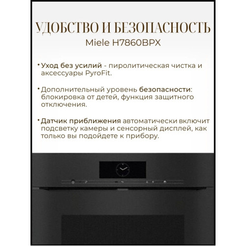 Сенсорный дисплей с датчиком приближения. Следите за приготовлением в любое время – камера в духовом шкафу. Уход без усилий – пиролитическая чистка и аксессуары PyroFit. Лёгкий способ достичь наилучших результатов: дополнительная влажность позволяет сохранить мясо нежным и сочным внутри и хрустящим снаружи; а при выпечке хлеба она помогает достичь такой пышности и подрумянивания, что придётся по вкусу каждому. Дополнительный уровень безопасности: для защиты от случайного открывания прибора, например, детьми, вы можете заблокировать доступ к нему. В экстренной ситуации функция защитного отключения просто незаменима: духовой шкаф Miele отключается автоматически, если максимальная продолжительность работы превышена. Поэтому можно больше не беспокоиться, если вы, уходя из дома, вдруг забыли выключить духовой шкаф.