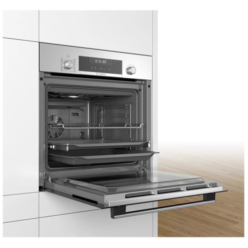 Встраиваемый духовой шкаф BOSCH серии Serie 6 с режимом конвекции и автоматическими программами станет настоящим помощником на кухне. Благодаря технологии 3D-горячий воздух вы сможете готовить несколько блюд одновременно и не опасаться, что запахи смешаются. Вам не понадобятся моющие средства, чтобы очистить камеру после приготовления. Просто включите режим пиролитической очистки и все засохшие загрязнения превратятся в пепел. Вам останется только убрать его губкой. Доставайте и загружайте противень без лишних усилий. Специальные полозья надежно удерживают противень, когда вы выдвигаете его из камеры. Перевернуть или попробовать блюдо теперь можно легко и безопасно. Телескопические направляющие переставляются на нужный уровень. В духовом шкафу установлены режимы нагрева для любого блюда: Верхний/нижний жар, Гриль с конвекцией, Режим для пиццы, большой Vario-гриль, Бережное тушение и даже Размораживание.