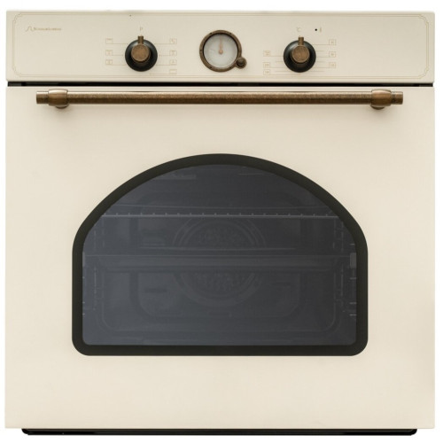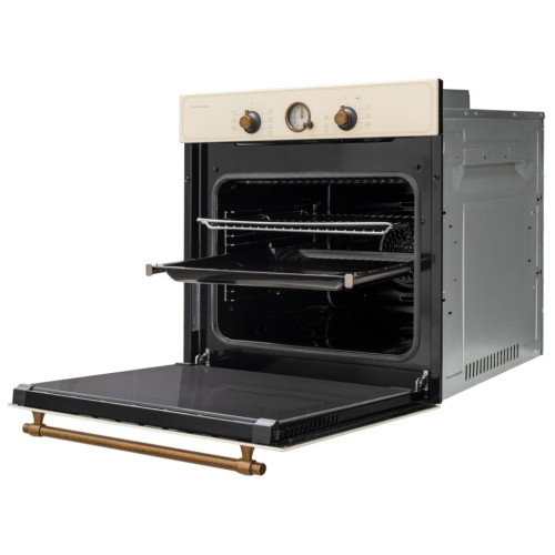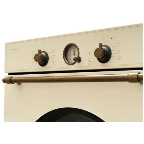 Духовой шкаф относится к стандартном типу духовок с шириной 59,5 см. Режимы духовки позволяют выбрать между разными комбинациями верхнего, нижнего нагревов и конвекции. Благодаря конвекции циркуляция воздуха по всей камере духовки непрерывная и равномерная. При этом не нужно беспокоиться, что блюдо подгорит или останется сырым: температура воздуха поддерживается на одном уровне во всем духовом шкафу. Гриль поможет добиться хрустящей корочки с сохранением сочности блюда. Режим применяется как основной или для доведения до готовности. Объем духовки составляет 61 л. Внутреннее покрытие камеры выполнено из эмали легкой очистки Easy Clean. Очистка духовки паровая, поэтому не придется прикладывать много усилий для поддержания ее чистоты. К другим преимуществам также относятся: Ретро-дизайн – выделяющийся дизайн духового шкафа выполнен в бежевом цвете. Переключатели и ручка дверцы также – в ретро стиле, имитируют бронзу. Гармоничное сочетание всех цветов и деталей, качественные материалы и исполнение придают духовому шкафу благородный вид. Аналоговый таймер с автоотключением дополняет оформление духового шкафа в ретро-стиле и предупредит, когда блюдо будет готово. Прочные и износостойкие хромированные направляющие для противней облегчают приготовления любимых блюд. С телескопическими направляющими вытащить противень удобно и не требует больших усилий: достаточно открыть дверцу и потянуть его на себя. В этот момент движутся только направляющие. Двухслойное съемное стекло дверцы защитит от ожогов. Съемное стекло также удобно и легко чистить. Технология EasyClean обеспечивает легкое снятие дверцы духовки для очистки.Внутреннее освещение поможет управлять процессом приготовления, не доставая блюдо из духовки. Особые высокопрочные петли обеспечивают бесшумное и плавное закрытие дверцы духовки при толчке любой силы. В комплекте: стандартный прямоугольный противень, глубокий противень и хромированная решетка.