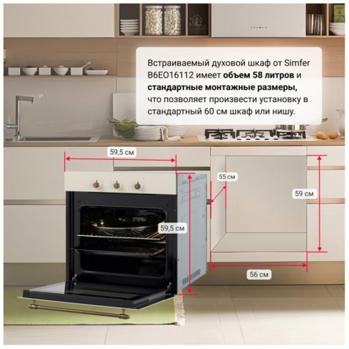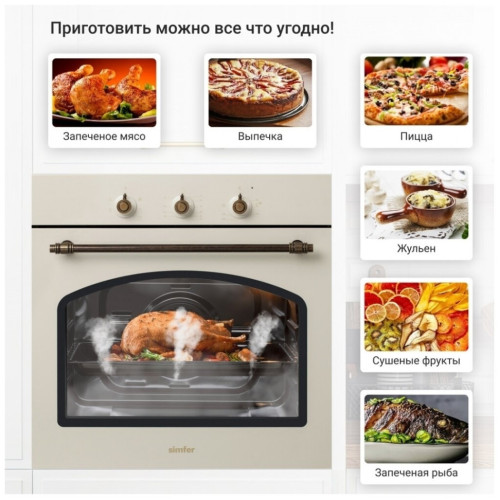 Электрический духовой шкаф Simfer B6EO16112 - современная техника для кухни, которая благодаря многообразию режимов, позволяет готовить не только повседневную пищу, но и изысканные блюда. Она снабжена функцией конвекции, которая равномерно распределяя теплый воздух, пропекает блюдо со всех сторон. А гриль запечет его до вкусной хрустящей корочки. С помощью удобных поворотных ручек легко выбрать необходимый режим приготовления для любого рецепта. Встроенная подсветка позволит наблюдать за процессом, не открывая при этом дверцу шкафа, а значит сохраняя тепло внутри.Таймер подскажет, когда блюдо будет готово, а тройное стекло защитит от ожога при случайном прикосновении к дверце шкафа. Эта простая в управлении, стильная и современная техника прекрасно впишется как в классический интерьер, так и в самый современный.