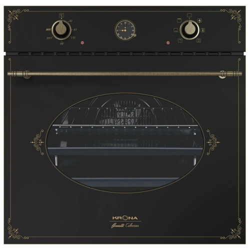 Электрический духовой шкаф Krona Merletto 60 идеально впишется в кухню с классическим оформлением. Оригинальная форма стекла и фурнитура с отделкой под натуральную бронзу делают его настоящим украшением интерьера. Многофункциональныйвстроенный гриль поможет вам запечь мясо, овощи и рыбу до аппетитной золотистой корочки. Конвектор, равномерно распределяющий потоки горячего воздуха, позволяет выпекать хрустящие круассаны и слойки. Практичныйвнутренние стенки устройства покрыты каталитической эмалью, которая растворяет жир при нагреве. Их можно очистить без сильнодействующих химикатов. Двухслойная дверца легко снимается и разбирается на части. Удобныйкогда вы не пользуетесь духовкой, аналоговый программатор с таймером на 90 минут превращается в стильные часы. Телескопические направляющие помогают аккуратно доставать готовые блюда, не обжигая руки.