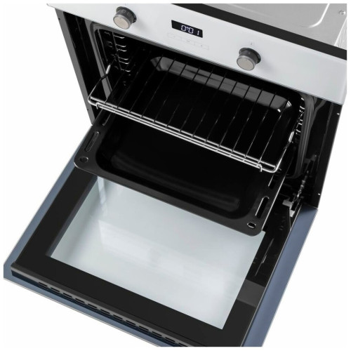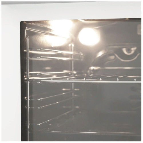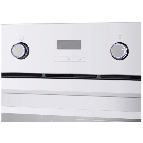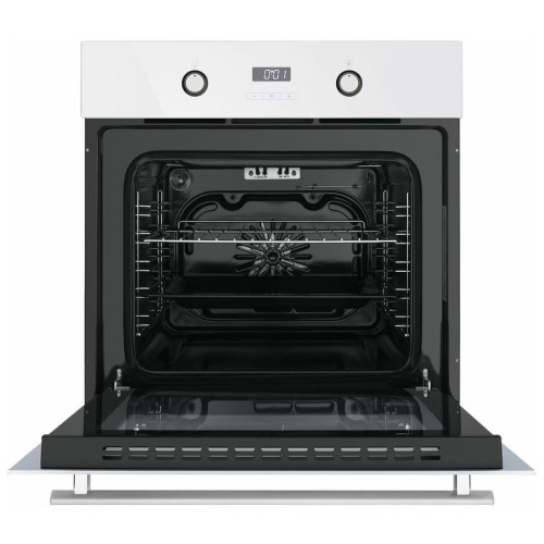 Видеообзор:Духовой шкаф оснащен разнообразным набором функций для приготовления: 1) верхний нагрев, 2) нижний нагрев, 3) верхний + нижний нагрев, 4) верхний + нижний нагрев + конвекция, 5) полный гриль, 6) гриль + конвекция, 7) ECO-энергосберегающий режим (тепловой нагрев ровно распространяется сверху и снизу), 8) внутренний свет (включается во время работы духового шкафа) Управление: Электронное Преимущества:Тройное стекло дверцыДисплейРучки Push PullГолубая подсветка дисплеяУстановлен охлаждающий вентилятор Компактный размерОбъем камеры - 57 литровВ комплект входит 1 решётка, 1 универсальный противеньЭнергопотребление Класс энергопотребления А. Эмаль легкой очистки Специальная эмаль не имеет пор, поэтому отталкивает жир, грязь и воду. Жир не прилипает к такой поверхности и облегчает уход за ней. Холодный фронт За счет того, что шкаф имеет тройное стекло дверцы, нагревание внешнего стекла происходит медленно. Цвет Белый