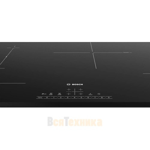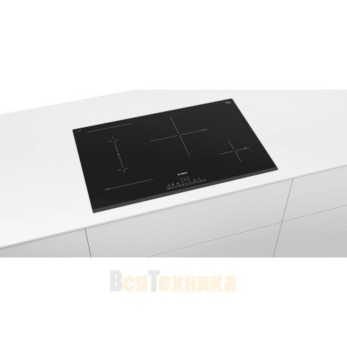 Индукционная варочная панель Bosch PVS831FB5E выполнена в черном цвете, имеет поверхность из стеклокерамики и 4 конфорки.