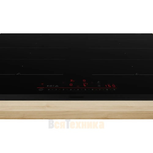 Управление реализовано через сенсорные элементы DirectSelect, которые позволяют интуитивно выбирать нужную конфорку и устанавливать один из 17 уровней мощности, а визуальная индикация на LCD-дисплее информирует о текущих настройках и оставшемся времени.