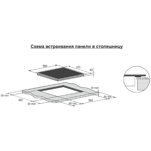 Безопасность защитное отключение конфорок, индикатор остаточного тепла, кнопка блокировки панели