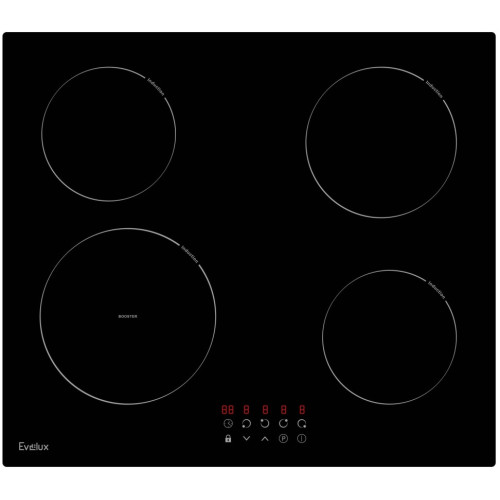 Сенсорное управление «Touch Control» Управление варочной поверхности за счет сенсорных кнопок облегчает процесс приготовления. Особенно актуально продуманное расположение и световая индикация кнопок. Индукция Индукционный нагрев считается одним из самых быстрых нагревов и имеет высокий КПД. Они нагревают непосредственно дно посуды. Стекло варочной поверхности нагревается только от посуды и по этой причине нагревается не очень сильно, быстро остывает в выключенном состоянии, что снижает риск получения ожогов и способствует легкому уходу за панелью. Таймер Электронный таймер поможет установить время продолжительности приготовления, после которого варочная поверхность остановит свою работу. Кроме этого можно установить акустический сигнал, который подается по истечению заданного времени даже, если варочная панель не находится в режиме приготовления. Автоматическое отключение Специальная функция, которая автоматически отключает варочную панель, если пользователь забыл это сделать сам. Время экстренного отключения панели или включенных конфорок зависит от заранее выбранного шага нагрева. Можно быть полностью уверенным в безопасности приготовления. Индикация остаточного тепла Световой индикатор у варочных поверхностях Evelux горит, пока температура конфорки не понизится до 60°С. Кроме безопасности использования, по световому индикатору можно понять, достаточно ли остыла варка для последующей чистки или нет. Функция «Защита детей» Evelux подумал о безопасности ваших малышей на кухне! Включив функцию «Защита детей» панель управления заблокируется, и маленький непоседа не сможет включить поверхность, это позволит быть уверенным, что не случится беды с подростающими поворятами. Функция «Booster» Функция «Booster» кратковременно повышает мощность конфорки на 15% и позволяет достичь особо быстрого нагрева больших объемов жидкости или быстрее разогреть посуду до нужной температуры, чтобы приступить к приготовлению.