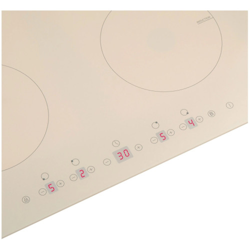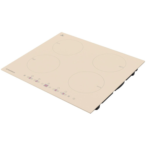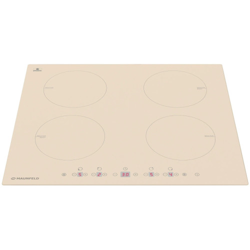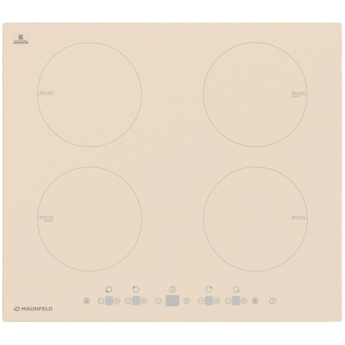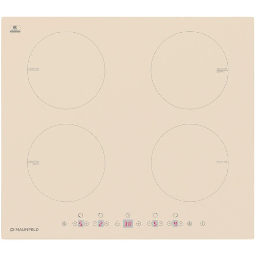 Индукционная варочная панель шириной 59 см выполнена из жаропрочного стекла японской фирмы Nippon Electric Glass бежевого цвета. Оно не только отличается высокими техническими показателями, но и легко очищается. Диаметр каждой из 4-х конфорок составляет 180 мм. Мощность: 2000, 2000, 1500, 1500 Вт (из них 2 бустера 2600 Вт). Сенсорное управление дает возможность: выбрать уровень мощности для каждой конфорки (9 уровней) заблокировать панель от детей выставить таймер (для отключения одной или нескольких варочных зон по истечении заданного времени) Предусмотрены следующие функции, упрощающие эксплуатацию плиты: Индикатор остаточного тепла укажет, какая из варочных зон ещё горячая. Детектор диаметра посуды экономит электроэнергию, нагревая только необходимую полезную поверхность конфорки. Автоматическое отключение в случае перегрева, долгого простоя работающей конфорки и при намокании поверхности варочной панели. Для приготовления на индукционной варочной панели пригодна посуда из ферромагнитного материала с ровными краями и плоским дном.