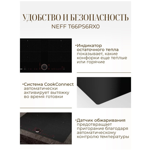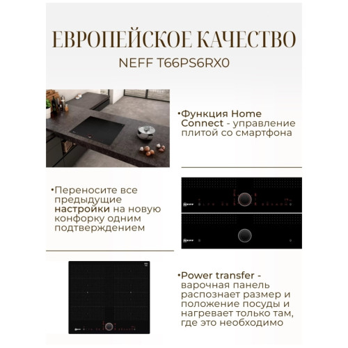 TwistPadFire® - наша съемная магнитная ручка управления с подсветкой обеспечивает точное управление всеми зонами приготовления пищи. Познакомьтесь с TwistPadFire®, нашим интуитивно понятным маленьким помощником. При легком прикосновении к TwistPadFire® загорается красное кольцо, после чего вы можете активировать нужную конфорку. Просто поверните эту оригинальную ручку, чтобы выбрать уровень мощности. Магнитный TwistPadFire® является съемным, благодаря чему устройство очень легко чистить. Extended Flex Induction — если вы хотите разогреть большую посуду, увеличьте поверхность плиты. Получите максимум от вашей печи. Иногда просто необходимо поставить на плиту и большие кастрюли, и широкие кастрюли, и противень для духовки. Вот почему мы создали решение Extended Flex Induction. Всего одним нажатием кнопки вы можете объединить конфорки в одну зону приготовления пищи, увеличив ширину и глубину плиты. Теперь вы можете разогревать еду по всей площади. Ваша плита даже понимает, где и какой формы находится посуда, и греет только нужные места. Power Move - просто перемещайте кастрюли и сковородки, чтобы изменить температуру. Одна гибкая область, три емкости. Вдохновленный печами профессиональных поваров, Power Move предлагает вам одну большую плиту с различными зонами: варить спереди, тушить посередине и поддерживать температуру пищи сзади. Просто переместите кастрюли и сковородки туда, где они вам нужны, и сосредоточьтесь на приготовлении пищи самостоятельно. Power Transfer — если вы измените положение горшка, настройка автоматически изменится вместе с ним. Передача энергии Передвигайте горшки, а не ваше внимание. Функция Power Transfer упрощает приготовление пищи с помощью расширяемых зон Flex на варочной панели Flex Induction, определяя уровень нагрева и размер кастрюли и автоматически перенося настройки в новое место, когда кастрюля перемещается вместе с посудой. Больше никаких нажатий или регулировок, достаточно легкого, успокаивающего прикосновения, чтобы сосредоточиться на самой сути приготовления – вашей интуиции. Home Connect - выбирайте настройки приготовления вашей умной плиты прямо с вашего мобильного телефона.