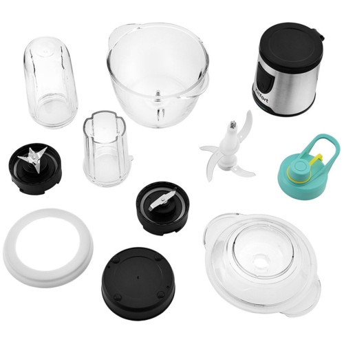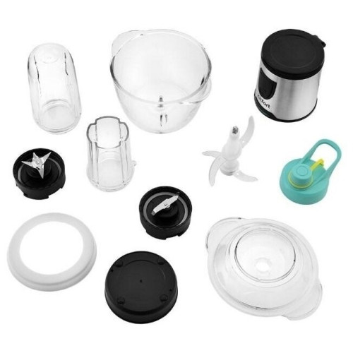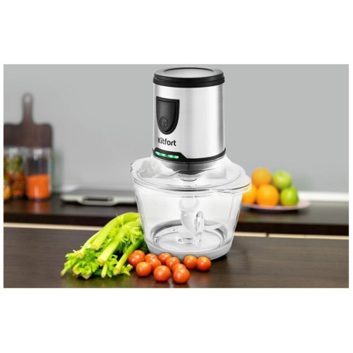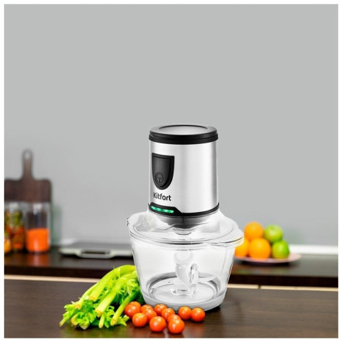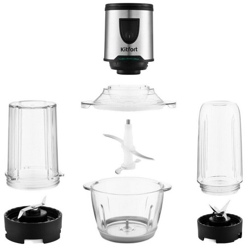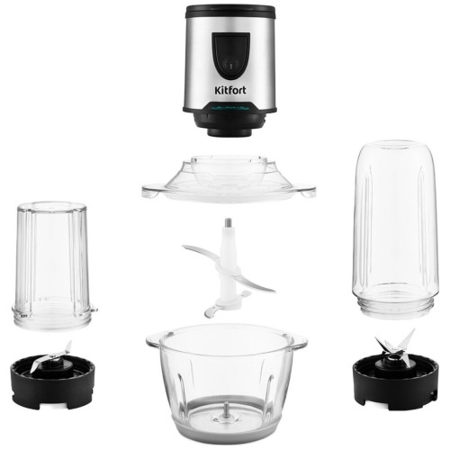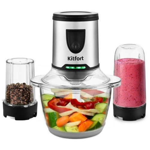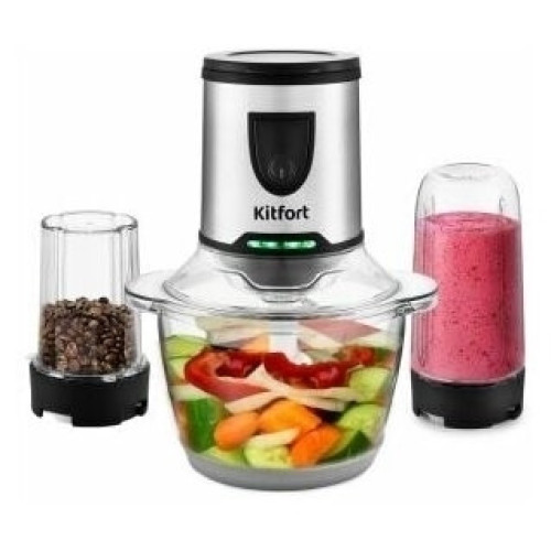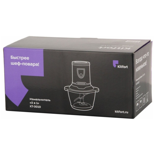 Измельчитель Kitfort КТ-3010 (3 в 1) Ваш универсальный помощник! Измельчитель «3 в 1» КТ-3010 выполняет функции не только измельчителя, но также кофемолки и блендера! Измельчитель справится с мясом, твёрдым сыром, овощами, травами, чесноком и ягодами. Широкий спектр возможностей Блендер позволит приготовить протеиновые смеси и фитнес-напитки, а также смузи и коктейли. Кофемолка с лёгкостью справится с кофейными зёрнами, специями и орехами. Многолезвийные ножи из нержавеющей стали Измельчитель, блендер, кофемолка и оснащены 4-лезвийными и 2-лезвийными блоками ножей. Лезвия выполнены из нержавеющей стали и отличаются своей силой, благодаря чему рубят продукты на высокой скорости вращения до 17 000 оборотов в минуту. Безопасный в использовании Чаша измельчителя ёмкостью 1,2 литра выполнена из стекла, а кофемолка ёмкостью 30 грамм и бутылка ёмкостью 0,4 литра - из прочного пластика, что гарантирует безопасность ваших напитков! Возьми с собой! В комплекте с устройством идёт бутылка с крышкой. Благодаря компактному размеру, её удобно взять с собой и использовать в любом месте: на работе, в спортивном зале, в машине или на пикнике. Простое управление Управление измельчителем осуществляется с помощью нажатия кнопки включения на передней панели. Для обеспечения безопасности устройство может работать только с правильно установленной чашей/бутылкой. Легко разбирается Устройство легко разбирается и позволяет тщательно промывать его детали.
