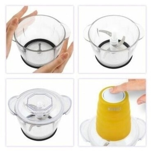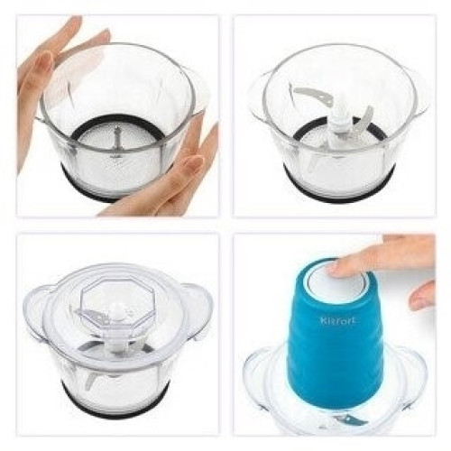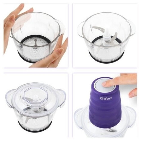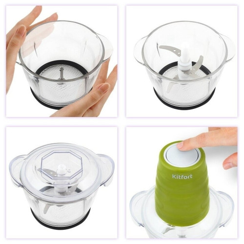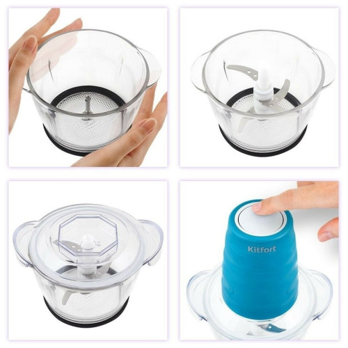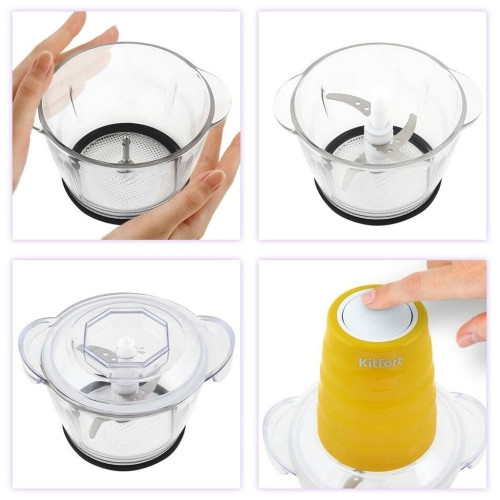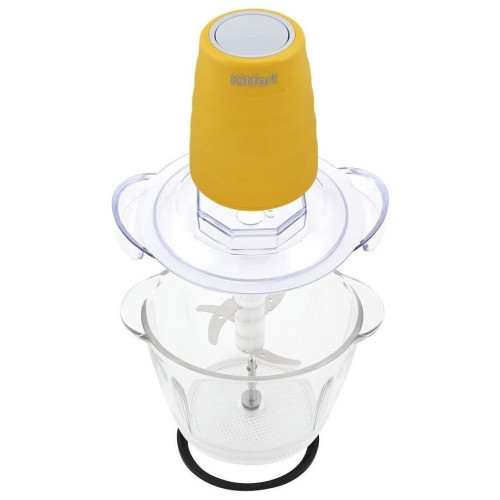 Измельчитель Kitfort КТ-3017-4 оранжевый Измельчитель Kitfort КТ-3017 быстро измельчает мясо, твердый сыр, овощи, травы, чеснок, ягоды и многое другое. Двойной нож измельчает продукты практически по всей высоте чаши. Чаша измельчителя сделана из экологически чистого материала — стекла. Чашу можно закрыть крышкой и использовать для хранения продуктов. Для обеспечения безопасности КТ-3017 может работать только с установленным моторным блоком. В комплекте к измельчителю идут защитные кожухи для ножей. Благодаря резиновой подкладке под чашу измельчитель меньше скользит по столу, а также дополнительно снижается вибрация и уровень шума при работе. Управление прибором осуществляется нажатием на кнопку сверху моторного блока. Измельчитель очень просто мыть, т.к. нож разборный и все элементы снимаются легко и быстро.