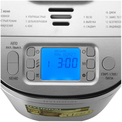 Хлебопечь HYUNDAI HYBM-M0313G серебристый/черный. Программ приготовления 13 Программ для теста 2 Запоминания программы ДА Замес теста ДА Бездрожжевая выпечка ДА Хлеб из безглютеновых смесей ДА Варение, джемы ДА Выпечка, кексы, шарлотки ДА Программы выпечки 11 Программы замеса теста 1 Поддержание температуры ДА Выбор цвета корочки ДА Окно контроля процесса ДА Таймер отсрочки старта 30 ч Диспенсер ДА