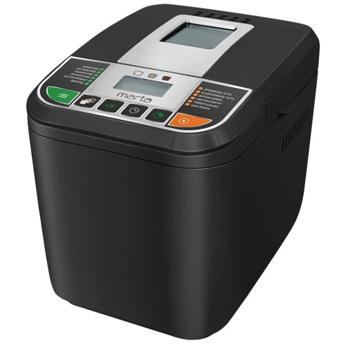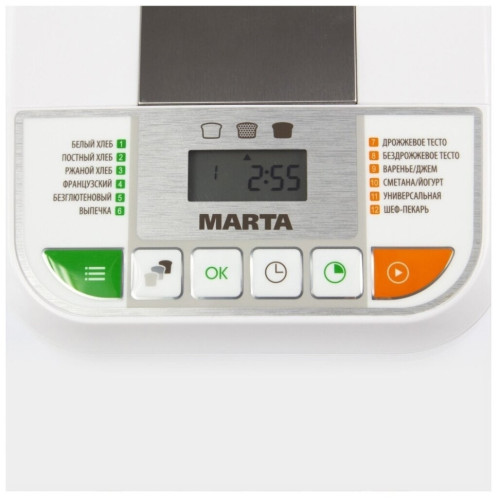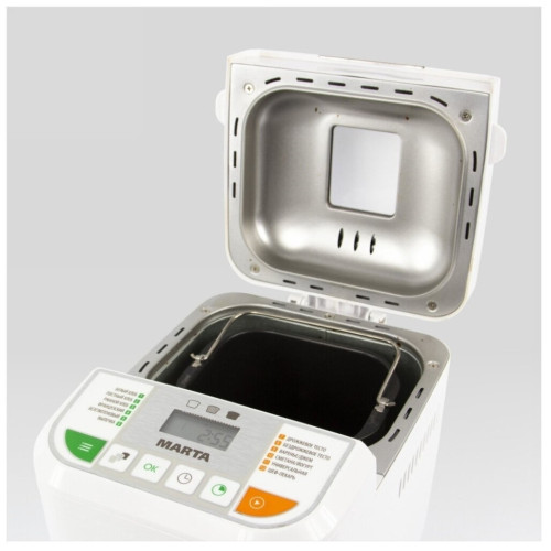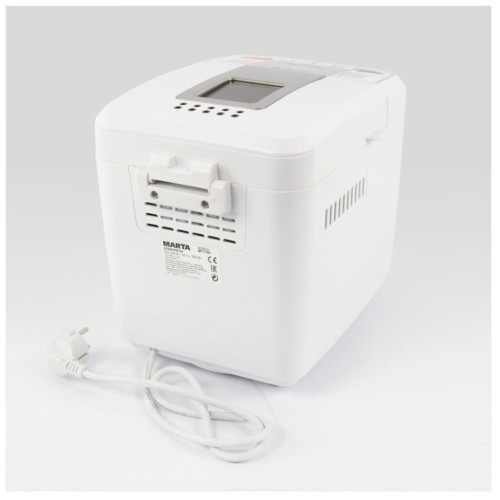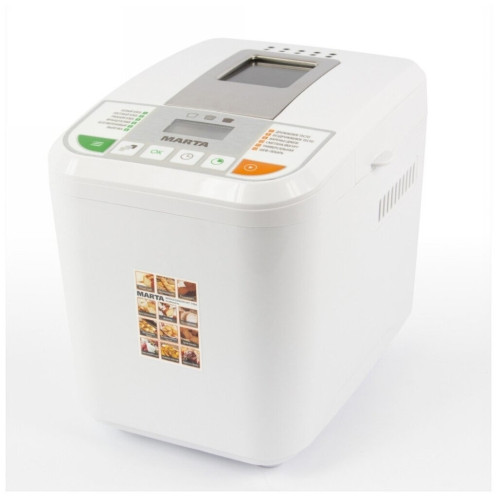 Хлебопечь Marta MT-1784 белый Хлебопечь предназначена не только для приготовления разнообразной выпечки, но и домашнего творога, йогуртов, а также всех видов варенья, джемов или конфитюров. Хлебопечь поддержит температуру готовой выпечки в течение 1-го часа, при отключении питания на 10 минут сохранит текущую программу, а с помощью программируемого таймера Вы сможете отложить старт ее работы до 12-ти часов. Панель управления и LCD дисплей позволят с легкостью выбрать подходящий режим и настроить один из трех возможных цветов хрустящей корочки. Современные материалы делают хлебопечь абсолютно безопасной в использовании и невероятно привлекательной внешне, а также обеспечивают ей максимально долгий срок службы. Модель превосходно впишется в дизайн любой кухни и будет долго радовать не только ароматом свежего хлеба, но и внешним видом.