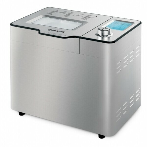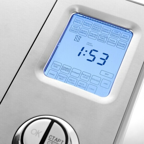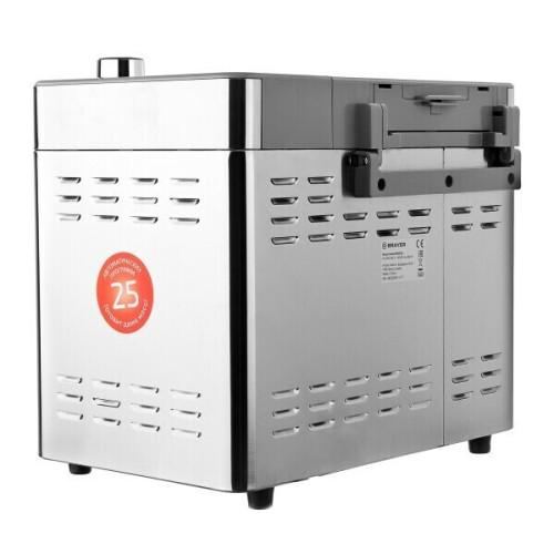 ощность 600 Вт. 25 автоматических программ Классический хлеб, французский хлеб, цельнозерновой хлеб, сладкий хлеб, диетический хлеб, безглютеновый хлеб, выпечка, джем, йогурт, жареные орехи Выбор размера выпечки 500/750/900 гр. Возможность выбора цвета корочки: светлая, средняя, темная LCD-дисплей с подсветкой Автозапуск программ при отсутствии электричества не более, чем через 10 минут Функция «паузы» Таймер (0-13 ч.) Поддержание температуры после выпекания 60 мин Звуковой сигнал по окончании работы Форма для выпечки с антипригарным покрытием Лопатки для замеса с керамическим покрытием Мерная ложка, стакан в комплекте Книга рецептов в комплекте Защита от перегрева Электропитание: 220-240 В., ~50 Гц.