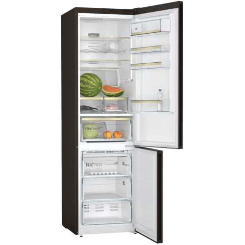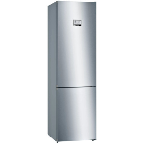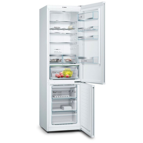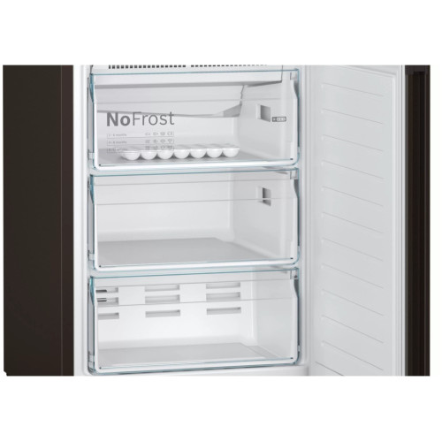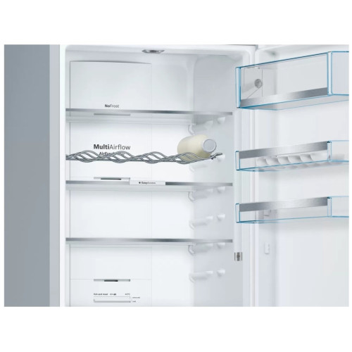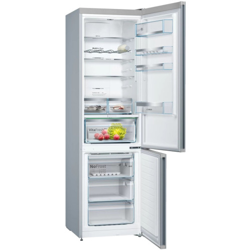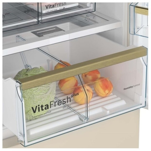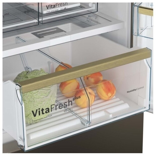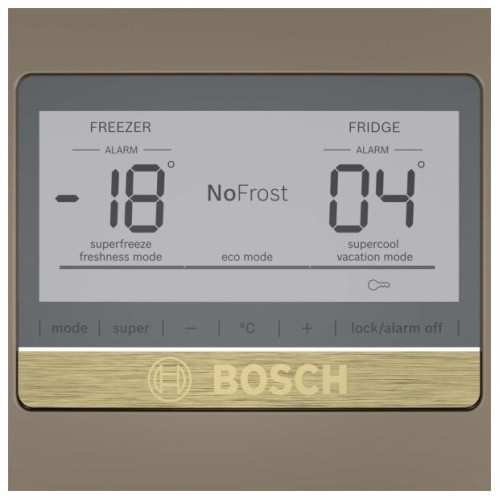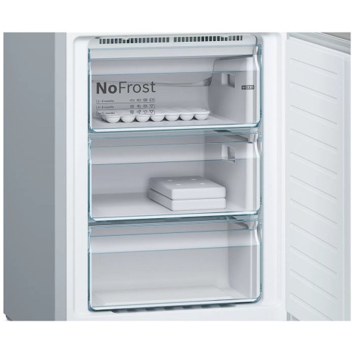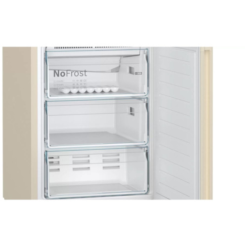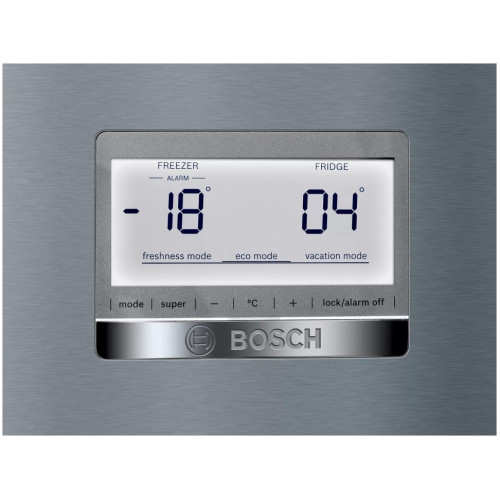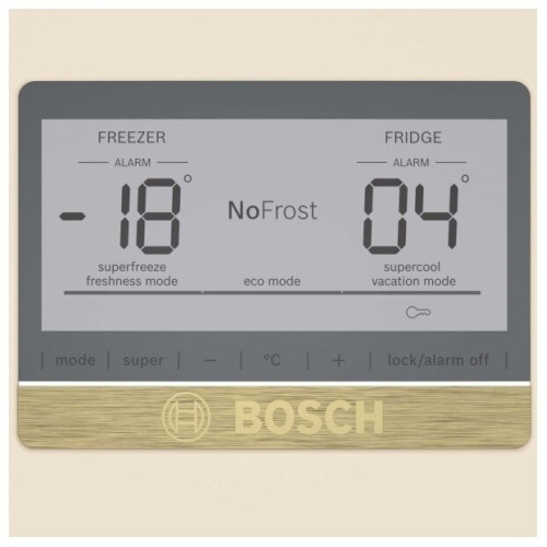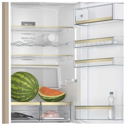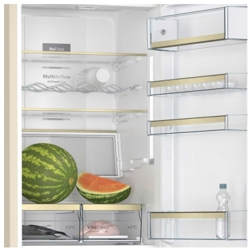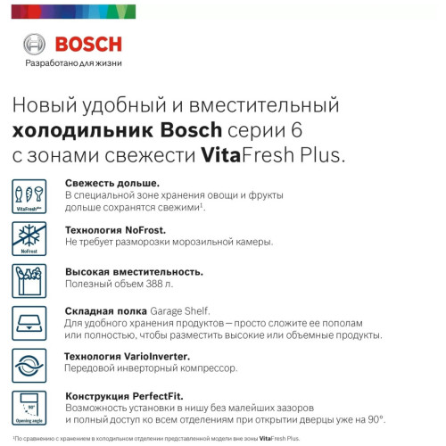 Холодильник с нижней морозильной камерой KGN39A 31R. Холодильно-морозильная комбинация NoFrost с зоной свежести VitaFresh plus сохраняет свежесть продуктов до 2 раз дольше. Больше, чем кажется: увеличенный объем холодильника 388 литров. Мы знаем, как важно, чтобы холодильник был вместительным и сохранял свежими максимум продуктов. Более тонкие стенки холодильника Bosch VitaFresh позволили увеличить полезный объем на 73 литра при прежних габаритах, в то время как передовые изоляционные материалы и компрессор Bosch VarioInverter обеспечивают более низкий уровень шума и низкое энергопотребление. Система идеального расположения PerfectFit сохраняет драгоценное место на кухне. Холодильники VitaFresh могут быть установлены на кухне вплотную к мебели и стенам, без зазоров сзади и сбоку. Кроме того, дверца холодильника открывается на 90 градусов, не требуя дополнительного пространства, при этом ящики, находящиеся внутри, легко вынимаются. С холодильником Bosch площадь кухни используется максимально рационально. Холодильник должен подстраиваться под вас: складная полка Garage Shelf предоставляет еще больше гибкости в расположении продуктов в холодильной камере. Сложите складную полку пополам, чтобы разместить, например, большую кастрюлю, арбуз или упаковку с напитками – или сложите полку полностью, если вам нужно еще больше свободного пространства. Тихий и экономичный: компрессор с передовой технологией Bosch VarioInverter. Холодильник работает очень тихо и потребляет меньше электроэнергии, чем холодильник с обычным компрессором. Компрессоры Bosch отличаются повышенной надежностью благодаря применению передовых технологий, поэтому срок гарантии на них для участников программы MyBosch — 10 лет. Светодиодная подсветка LED: яркое и равномерное освещаение пространства холодильника.