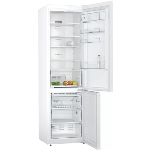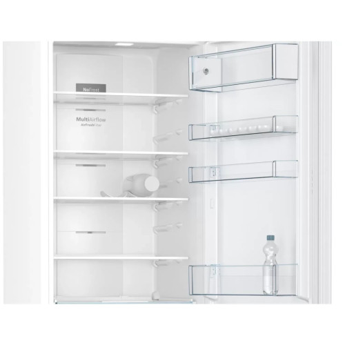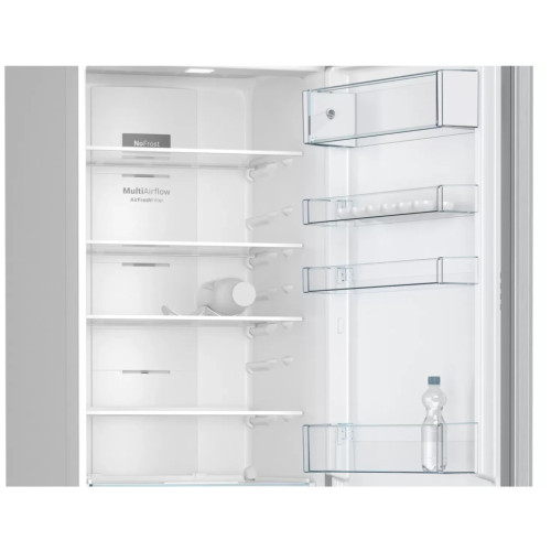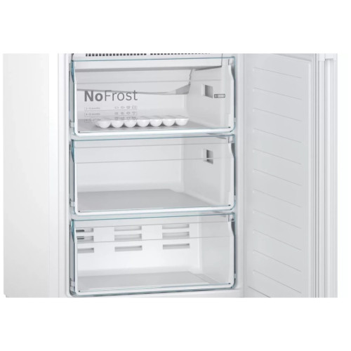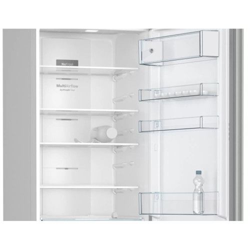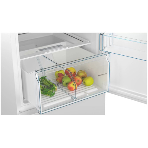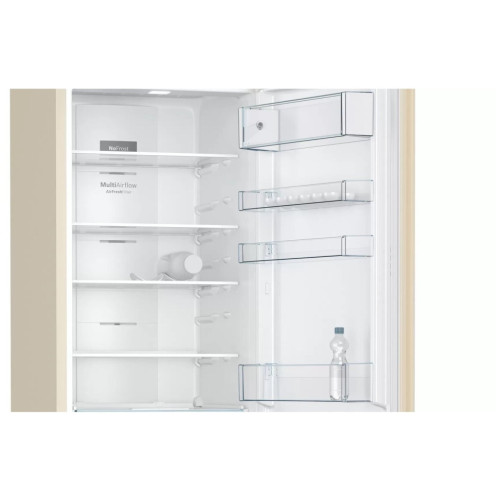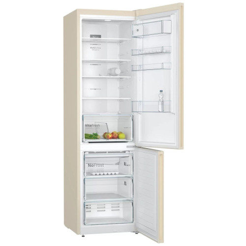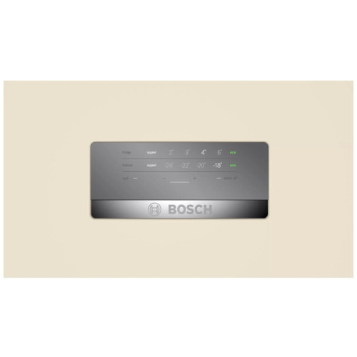 Двухкамерный холодильник Bosch KGN39V 25RSerie 4 с инверторным двигателем и двумя контурами охлаждения позволяет точно выставлять температуру в морозильном и холодильном отделениях вне зависимости друг от друга. Датчики FreshSense контролируют и поддерживают нужную температуру в обоих отделениях, чтобы максимально продлить срок хранения продуктов. Холодильник KGN39VI25R легко впишется в интерьер кухни. Установите его вплотную к стенам и мебели — никаких зазоров сзади и по бокам. Дверца открывается на 90°, позволяя легко выдвигать полки и ящики. НЕ ТРЕБУЕТ РАЗМОРОЗКИ Благодаря системе NoFrost в морозилке не образуется иней и наледь, а продукты не примерзают друг к другу. Влага автоматически выводит и вам не придется размораживать холодильник вручную. ИДЕАЛЬНЫЕ УСЛОВИЯ ХРАНЕНИЯ Система MultiAirflow с вентилятором равномерно распределяет холодный воздух по камере и поддерживает равномерную температуру и влажность сверху донизу. Угольный фильтр AirFresh устраняет неприятные запахи и не дает бактериям размножаться. ЗОНА СВЕЖЕСТИ В контейнере VitaFresh овощи, фрукты и зелень дольше сохраняют свежесть и внешний вид. Вы можете установить один из трех уровней влажности, в зависимости от хранящихся продуктов. Удобная перегородка поможет разделить продукты. ЭРГОНОМИЧНОЕ ПРОСТРАНСТВО В холодильной камере установлено пять полок из закаленного стекла. Четыре полки с системой крепления EasyAccess плавно выдвигаются вперед даже при полной загрузке, чтобы вы смогли достать небольшую баночку у стенки. В комплект входит подставка для бутылок и яиц, а также масленка. Камера ярко подсвечивается светодиодами, которые потребляют минимум электроэнергии и служат дольше обычных лампочек. В морозильной камере установлено три выдвижных контейнера, где удобно хранить пакеты и коробки с заморозкой. За сутки можно заморозить до 15 кг продуктов. СУПЕРБЫСТРОЕ ОХЛАЖДЕНИЕ В холодильнике Bosch KGN39VI25R предусмотрены функции быстрого охлаждения и замораживания. Функция SuperCooling быстро охлаждает новую партию продуктов. Функция SuperFreeze быстрее замораживает свежие ягоды или мясо, чтобы сохранить больше витаминов, а также защищает уже замороженные продукты от размораживания. ЭЛЕКТРОННОЕ УПРАВЛЕНИЕ Установить температуру или включить дополнительные функции можно не открывая дверцы. На внешней стороне дверцы расположен LED дисплей — удобно контролировать работу холодильника и делать настройки. Если дверца осталась приоткрытой или возникла неисправность, то раздастся звуковой сигнал и на дисплее загорится соответствующий индикатор.