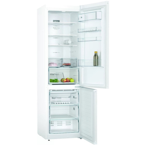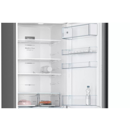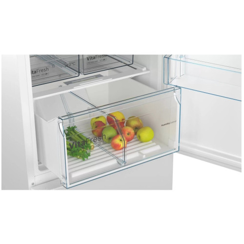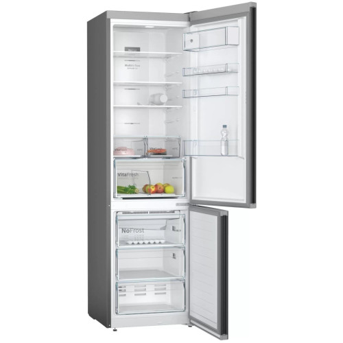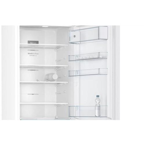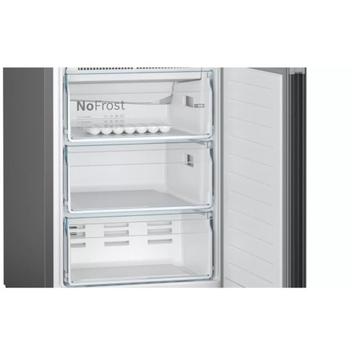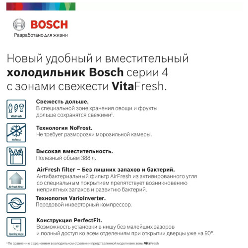 Холодильник Bosch Serie | 4 KGN39X 27R сохранит продукты свежими в течение длительного времени. В этом прибору помогают датчики FreshSense и встроенный вентилятор системы MultiAirflow, который улучшает циркуляцию воздуха, за счёт чего в каждом отсеке будут созданы одинаково оптимальные условия хранения. РАЗДЕЛЬНЫЙ КОНТРОЛЬ Сенсорная панель управления с наглядными надписями и символами позволяет парой прикосновений задать все настройки. А благодаря двухконтурной конфигурации вы легко выставите индивидуальные параметры температуры для обеих камер. НАДЁЖНЫЙ ЩИТ Активировав режимы повышенной мощности SuperCooling и SuperFreeze, вы не дадите теплу проникнуть внутрь устройства. Это, в свою очередь, не даст еде испортиться. ОБСЛУЖИВАНИЕ И ГИГИЕНА Морозильное отделение не нуждается в ручном оттаивании. Этот процесс происходит автоматически через определённые промежутки времени. Образовавшаяся влага выводится в специальный поддон, откуда просто-напросто испаряется. Должную степень чистоты обеспечивает угольный фильтр AirFresh, отвечающий за защиту от бактерий и неприятных запахов. ГРАМОТНО ОРГАНИЗОВАНО Внутри прибора вы найдёте полки из закалённого стекла, которые можно перемещать повыше и пониже. На дверце есть «балкончик» для бутылок и место для установки лотка с яйцами. В контейнере зоны свежести создан оптимальный микроклимат, чтобы фрукты, овощи и зелень долго не вяли. В трёх пластиковых ящиках морозильного отделения много пространства для съестных припасов вроде мяса и различных полуфабрикатов. ДЛЯ ВАШЕЙ БЕЗОПАСНОСТИ О том, что Bosch Serie | 4 KGN39XC27R остался открытым сразу сообщит индикатор со светом и звуком. Он же включается при возникновении ошибок в работе устройства. ВАЖНАЯ МЕЛОЧЬ LED-лампочки ярко и равномерно освещают содержимое каждого яруса. Эта особенность позволяет предельно тщательно очистить все поверхности во время уборки. ИДЕАЛЬНО ВПИШЕТСЯ Сохраните максимум драгоценного места на кухне с моделью PerfectFit. Её можно поставить вплотную к стене, не оставляя ни единого зазора. Плюс для доступа к выдвижным ящикам больше не нужно распахивать холодильник – вы без труда достанете продукты, даже если дверь открыта всего на 90°.