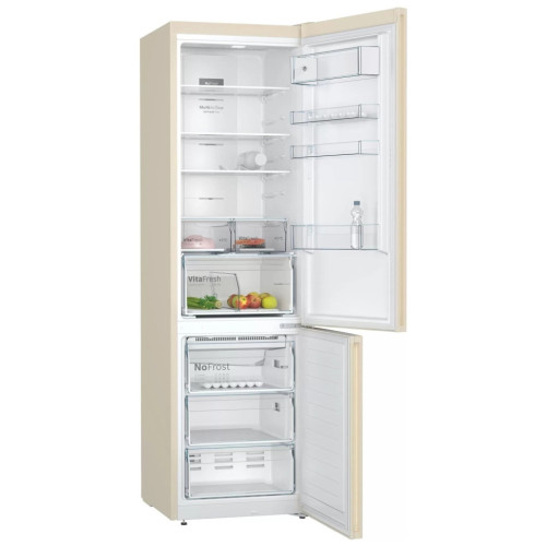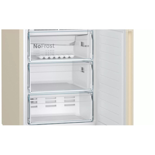 Холодильник Bosch Serie | 4 kgn39xk27r сохранит продукты свежими в течение длительного времени. В этом прибору помогают датчики FreshSense и встроенный вентилятор системы MultiAirflow, который улучшает циркуляцию воздуха, за счёт чего в каждом отсеке будут созданы одинаково оптимальные условия хранения. Сенсорная панель управления с наглядными надписями и символами позволяет парой прикосновений задать все настройки. А благодаря двухконтурной конфигурации вы легко выставите индивидуальные параметры температуры для обеих камер. Активировав режимы повышенной мощности SuperCooling и SuperFreeze, вы не дадите теплу проникнуть внутрь устройства. Это, в свою очередь, не даст еде испортиться. Морозильное отделение не нуждается в ручном оттаивании. Этот процесс происходит автоматически через определённые промежутки времени. Образовавшаяся влага выводится в специальный поддон, откуда просто-напросто испаряется. Должную степень чистоты обеспечивает угольный фильтр AirFresh, отвечающий за защиту от бактерий и неприятных запахов. Внутри прибора вы найдёте полки из закалённого стекла, которые можно перемещать повыше и пониже. На дверце есть «балкончик» для бутылок и место для установки лотка с яйцами. В контейнере зоны свежести создан оптимальный микроклимат, чтобы фрукты, овощи и зелень долго не вяли. В трёх пластиковых ящиках морозильного отделения много пространства для съестных припасов вроде мяса и различных полуфабрикатов. О том, что Bosch Serie | 4 kgn39xk27r остался открытым сразу сообщит индикатор со светом и звуком. Он же включается при возникновении ошибок в работе устройства. LED-лампочки ярко и равномерно освещают содержимое каждого яруса. Эта особенность позволяет предельно тщательно очистить все поверхности во время уборки. Сохраните максимум драгоценного места на кухне с моделью PerfectFit. Её можно поставить вплотную к стене, не оставляя ни единого зазора. Плюс для доступа к выдвижным ящикам больше не нужно распахивать холодильник – вы без труда достанете продукты, даже если дверь открыта всего на 90°.