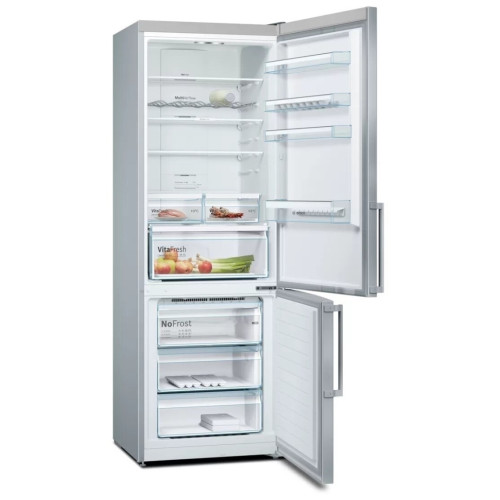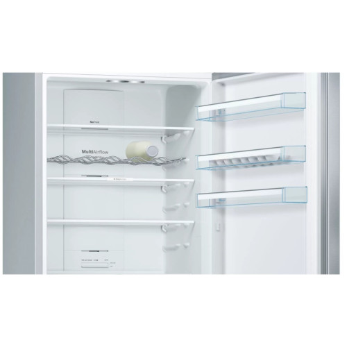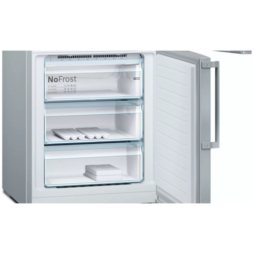 Холодильник с нижней морозильной камерой с общим объёмом 466 л и зоной свежести VitaFresh: дольше сохраняет свежесть продуктов - благодаря оптимальным условиям хранения- пониженной температуре в отделениях для рыбы и мяса и регулируемой влажности в отделении для овощей и фруктов. Светодиодная подсветка привносит в холодильник Bosch VitaFresh совершенно новую концепцию освещения, гарантируя равномерное освещение всего пространства без бликов. Светодиодные лампы потребляют меньше электроэнергии, чем обычные лампы накаливания, и служат в течение всего срока службы прибора. Размещение продуктов в холодильнике может вызвать сложности: в некоторых отделениях они остаются свежими, в других – высыхают. Система MultiAirflow с вентилятором усиливает циркуляцию воздуха внутри холодильника и поддерживает равномерную температуру и влажность сверху донизу. Колебания температуры минимальны, сокращается время охлаждения – это помогает сохранить свежесть и вкус продуктов дольше. EasyAccess - это система крепления полок из закаленного ударопрочного стекла. Полки плавно выдвигаются даже при полной загрузке, чтобы можно было с легкостью достать продукты даже из самого дальнего уголка холодильника. Дополнительные удобство и комфорт. Благодаря простому управлению и 2 контурному охлаждению есть возможность регулировать температуру с максимальной точностью без потери в эффективности охлаждения. При открывании холодильника проникает тёплый воздух, способный испортить находящиеся внутри продукты. Для их защиты активизируется функция SuperCoolingl и температура в холодильнике быстро понижается. Функция SuperCooling также обеспечивает более быстрое охлаждение только что поставленных продуктов. Температура понижается нажатием кнопки (не ниже 2 °C). Чтобы избежать лишних затрат электроэнергии, эта функция автоматически выключается примерно через шесть часов. Функция SuperCooling сохраняет свежесть старых и новых продуктов с помощью разумного прогнозирования.