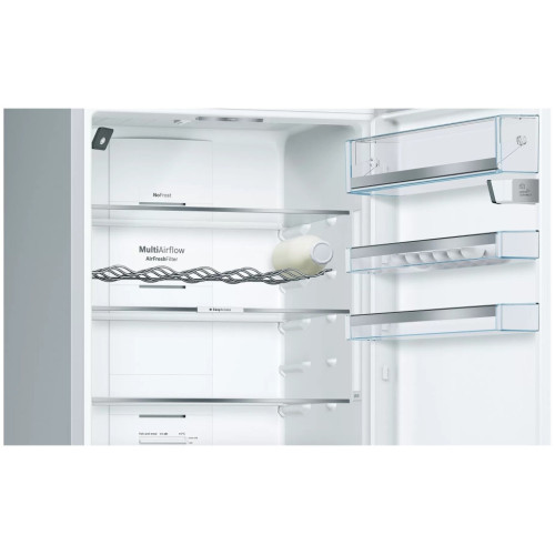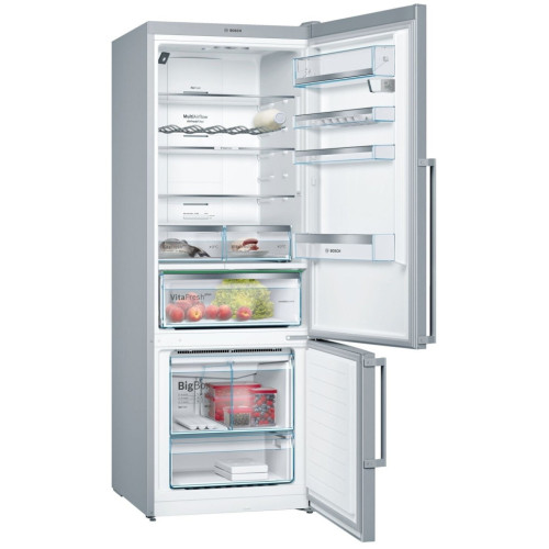 Холодильник с нижней морозильной камерой системы NoFrost с общим обьемом 559 л и системой свежести VitaFresh plus предоставляет намного больше места для хранения продуктов и до двух раз дольше сохраняет их свежесть. Благодаря регулируемому механизму контроля уровня влажности, ящик VitaFresh plus будет сохранять свежесть ваших овощей и фруктов до двух раз дольше. Благодаря регулируемому механизму контроля температуры, ящик VitaFresh 0°C способствует сохранению свежести ваших продуктов с особым требованием к хранению (рыба, мясо и др.) до двух раз дольше. Мультифункциональное использование: благодаря новой выдвижной конструкции, теперь стало еще проще вытащить ящик для того, чтобы создать дополнительное пространство. Оптимально расположенная подсветка LED Side и LED Spot, освещающая ящик для фруктов и овощей, обеспечивает гораздо больше яркости. Надверная LCD электроника со специальными функциональными установками – простое регулирование температуры холодильной и морозильной камеры. 1