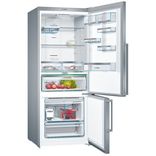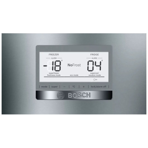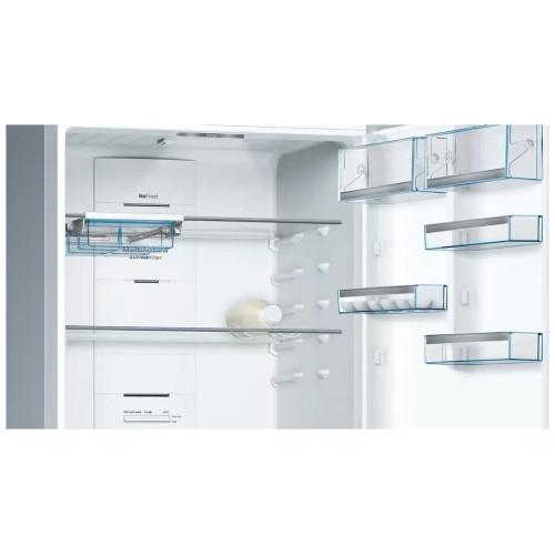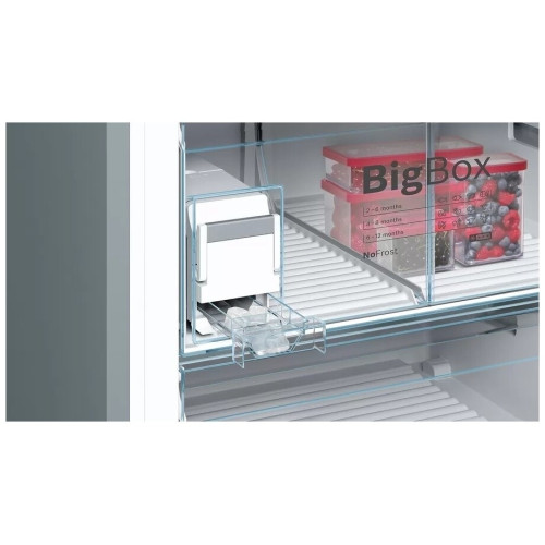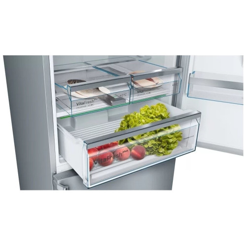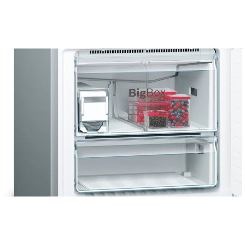 В холодильнике Bosch KGN76AI22R объём которого составляет 521 л, созданы оптимальные условия для хранения внушительного запаса продуктов. Он пригодится большой семье и даст возможность реже ходить в магазин. Обе камеры размораживаются в автоматическом режиме. Для этого предусмотрена постоянная циркуляция прохладного воздуха, благодаря которому на стенках не образуется ледяная корка. Система вентиляции дополнена угольным фильтром, устраняющим неприятные запахи. Отделение VitaFresh plus предназначено для хранения недавно купленных мяса, рыбы, фруктов и овощей. В нём есть контейнер с регулируемым уровнем влажности. Эта модель оборудована встроенными датчиками FreshSense, которые контролируют температуру и поддерживают её на установленном уровне. Важную информацию в любой момент можно просмотреть на дисплее, размещённом с внешней стороны двери. Если потребуется, вы легко измените настройки. Внутреннее пространство освещается боковыми и потолочными LED-лампами, расположенными таким образом, чтобы обеспечить наилучший просмотр содержимого полок и контейнеров.