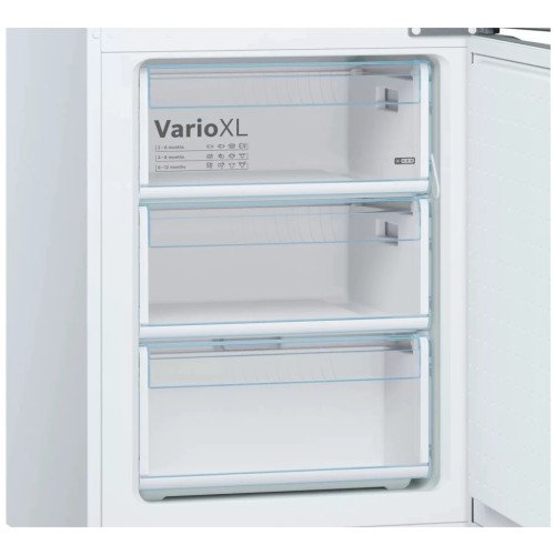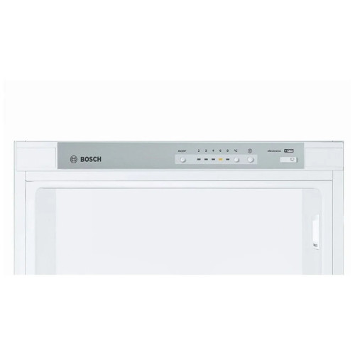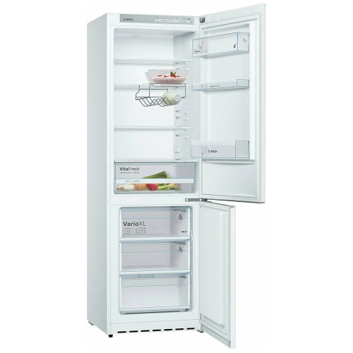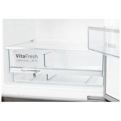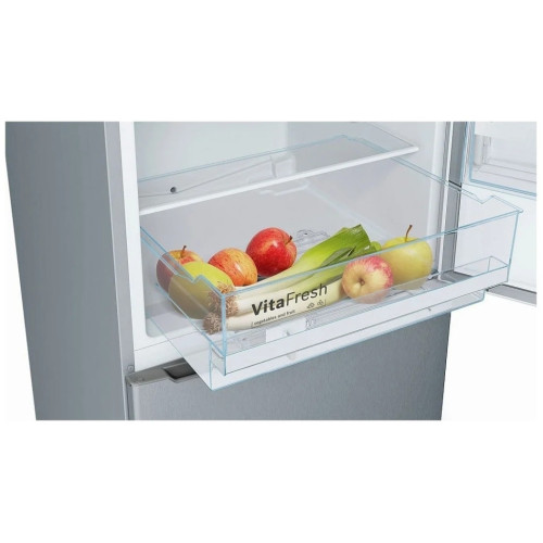 KGV36XW21R Холодильник с нижней морозильной камерой. Технология NatureCool сохраняет естественную свежесть, вкус и аромат продуктов благодаря оптимальному уровню влажности. Светодиодная подсветка привносит в холодильник Bosch VitaFresh совершенно новую концепцию освещения, гарантируя равномерное освещение всего пространства без бликов. Светодиодные лампы потребляют меньше электроэнергии, чем обычные лампы накаливания, и служат в течение всего срока службы прибора. Постоянная температура в интерьере холодильника - решающий фактор в достижении длительного срока хранения продуктов. Датчики FreshSense постоянно контролируют и поддерживают температуру в холодильном и морозильном отделениях. Функция SuperFreezing защищает замороженные продукты от размораживания.
