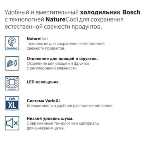 Светодиодная подсветка LED ярко и равномерно освещает пространство холодильника. Технология NatureCool сохраняет естественную свежесть, вкус и аромат продуктов благодаря оптимальному уровню влажности. SuperFreezing- защищает замороженные продукты от размораживания.