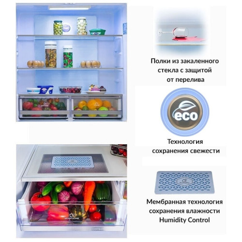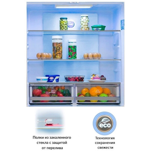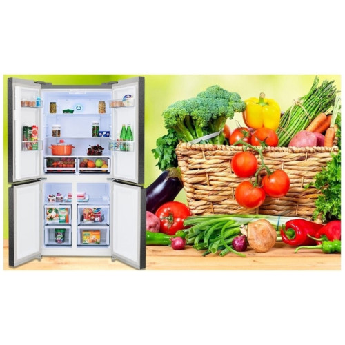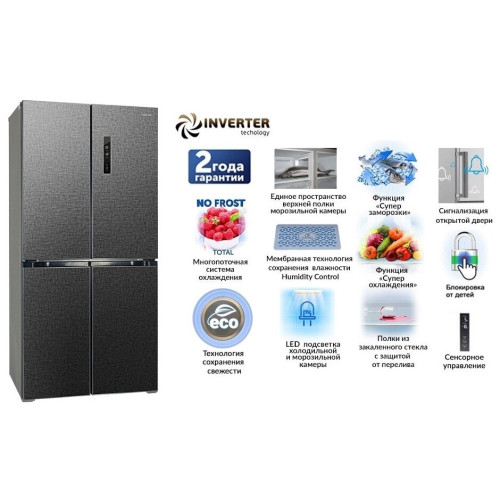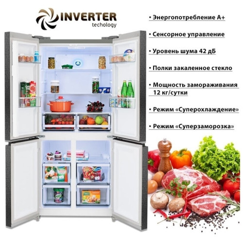 Отдельностоящий, стильный и вместительный холодильник HIBERG RFQ 490DX NFXQ INVERTER предназначен для хранения большого количества продуктов и напитков в частных и загородных домах, крупногабаритных квартирах и офисах. 4-х дверный холодильник имеет общий объем 490 л, единое пространство верхних полок холодильной камеры, чтобы удобно было размещать габаритные кастрюли и контейнеры. Прочные полки из закаленного стекла можно регулировать по высоте, а ящики в холодильной камере предназначены для хранения овощей и фруктов. Устройство имеет систему охлаждения Total No Frost, с которой Вам не придется больше размораживать холодильник, достаточно обычного ухода раз в 6 месяцев. Холодильник HIBERG RFQ 490DX NFXQ обладает высоким классом энергоэффективности А+. Инверторный компрессор обеспечивает практически бесшумную работу с минимальным энергопотреблением. Модель имеет LED – освещение в обеих камерах, а так же сенсорное управление с встроенным фантомным дисплеем, на котором отображается температура и режимы работы. Режимы «Суперзаморозка» и «Суперохлаждение» обеспечивают быстрое охлаждение продуктов в морозильной или холодильной камере и далее поддерживают оптимальную температуру для хранения. Многопоточная система охлаждения поддерживает оптимальную температуру на каждой полке, поэтому продукты дольше остаются свежими. Мембранная технология улучшает условия хранения овощей и фруктов, поддерживая уровень влажности в ящиках до 90%. Режим «Отпуск» позволит сэкономить электроэнергию за счет редкого включения инверторного компрессора в период долгого отсутствия членов семьи. Модель RFQ 490DX NFXQ имеет функцию «Блокировка от детей», а так же предупреждающий звуковой сигнал, если дверь открыта больше двух минут. Двери выполнены из нержавеющей стали в цвете «серебристый лен». Особенности и преимущества: - 4 двери; - инверторный компрессор; - Total No Frost; - цвет фасада: «серебристый лен»; - материал покрытия дверей: нержавеющая сталь; - фантомный дисплей с сенсорным управлением. Холодильник HIBERG RFQ 490DX NFXQ INVERTER – это высококлассное устройство, которое сочетает в себе техническое совершенство, удобство хранения и современный дизайн!
