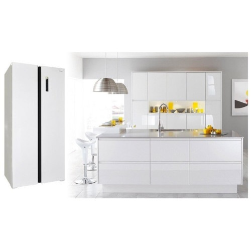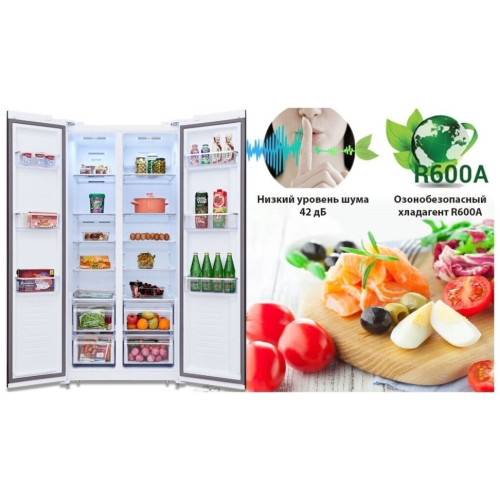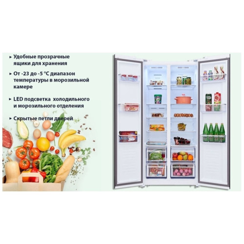 Холодильник Side-by-Side Hiberg RFS-480DX NFW – современный прибор с продуманным внутренним оснащением, удобным электронным управлением и системой автоматического размораживания No Frost, которая будет экономить ваше время и силы. Общий объём устройства – 476 литров, из них 176 литров – морозильная камера, так что поместятся и запасы для большой семьи на пару недель, и сезонные заготовки. Оборудование включает в себя прочные полки, выполненные из закалённого стекла, выдвижные ящики и «карманы» на дверцах, что позволит рассортировать продукты по типам. Всю информацию о работе прибора предоставит сенсорный дисплей, удобно расположенный снаружи, на фасадной части. Если вы забудете закрыть дверцу или в камерах внезапно начнёт подниматься температура, вас оповестит звуковой сигнал. При отключении электроэнергии ваши запасы будут сохраняться от таяния в течение 9 часов. Совершили большой «набег» на супермаркет? Вам пригодятся режимы «Суперохлаждение» и «Суперзамораживание». Они не позволят свежим припасам устроить в холодильнике «глобальное потепление». Если вам предстоит поездка на одну-две недели, не стоит отключать устройство, достаточно активировать функцию «Отпуск».
