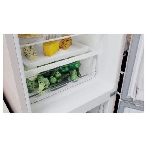 Характеристики холодильника Hotpoint с морозильной камерой: оптимальный объем для хранения еды и напитков для всей семьи. Цвет Inox. Технология No Frost обеспечивает равномерное распределение воздуха в холодильной камере, предотвращая образование инея. Прочные стеклянные полки. Прочная дверная полка для хранения бутылок.
