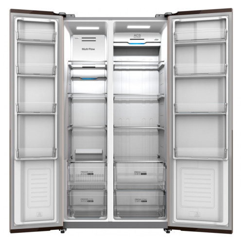 2-х дверный холодильник Side by Side привлекает продуманным функционалом и лаконичным дизайном . Полезный объем холодильника- 518 литров. Инверторный компрессор обладает повышенным ресурсом, экономичностью и низким уровнем шума Для удобства хранения в холодильнике предусмотрены регулируемые по высоте полки из закаленного стекла, выдвижные ящики и мягкая светодиодная подсветка. В дверках холодильника предусмотрены дополнительные вместительные полки для хранения напитков, детского питания и продуктов. Управление настройками холодильника и морозильной камеры сенсорное и расположено на внешней дверке. В холодильнике предусмотрена блокировка панели управления, чтобы случайно никто не поменял температурный режим. Звуковой сигнал проинформирует о том, что двери холодильника не полностью закрыты. Не беспокойтесь о образовании наледи и инея в морозильной камере – размораживание происходит автоматически по технологии Total No Frost. В холодильнике HYUNDAI CS5005FV предусмотрены регулируемые по высоте ножки, на случай если поверхность, на которую будет установлен холодильник не ровная. Размеры (ШхВхГ) 91 х 181 х 66 см.Вес (нетто) 86 кг. Гарантия 2 года.