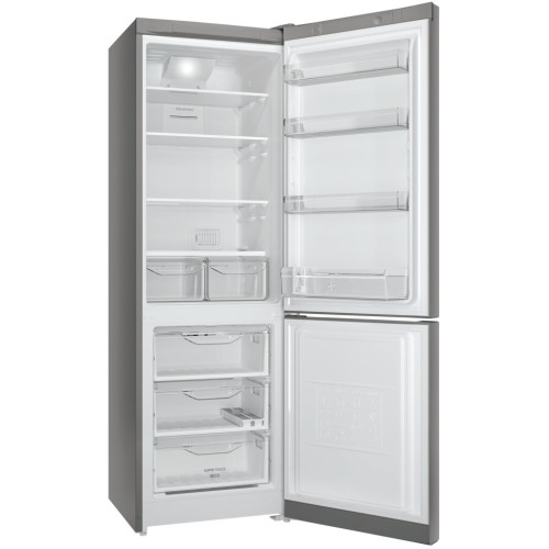 Indesit DF5180S - стильный современный холодильник с нижней морозильной камерой, оснащённый электронной системой управления. Это вместительная модель, позволяющая хранить большое количество продуктов.