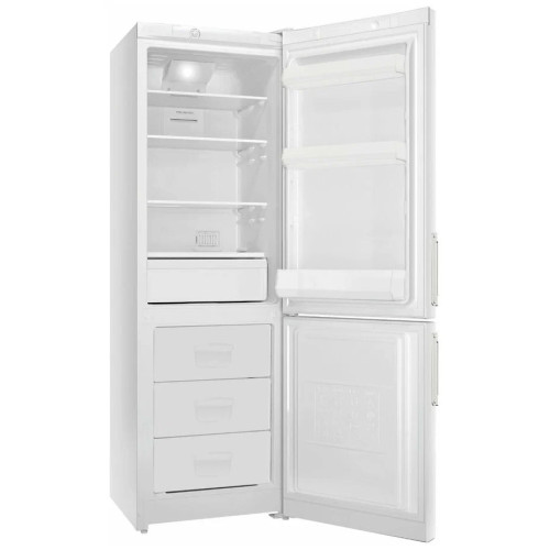 Холодильник Indesit ETP 20 имеет в основном отделении крепкие полки, которые можно переставлять на разные уровни для удобного хранения крупных упаковок с продуктами питания, посуды с пищей. Выдвижной пластиковый ящик оптимален для складывания зелени и ягод, грибов, фруктов и овощей. Лампочка обеспечивает качественное освещение внутреннего пространства камеры, что облегчает поиск содержимого. Благодаря системе Full No Frost происходит циркуляция холодного воздуха, который удаляет влагу и предотвращает образование на стенках инея. За счет этого не нужно выполнять размораживание вручную. В морозильной камере есть три выдвижных пластиковых ящика, оптимальных для хранения мяса и рыбы, различных полуфабрикатов, ягод и зелени, масла. Терморегулятор позволяет самостоятельно выбрать температурный режим в зависимости от условий эксплуатации устройства и загрузки. При отключении электрической энергии оптимальная температура внутри отделений держится в течение 13 ч, благодаря чему продукты питания не утрачивают потребительские качества. Для ровной установки холодильника Indesit ETP 20 на полу можно отрегулировать две передние опоры.